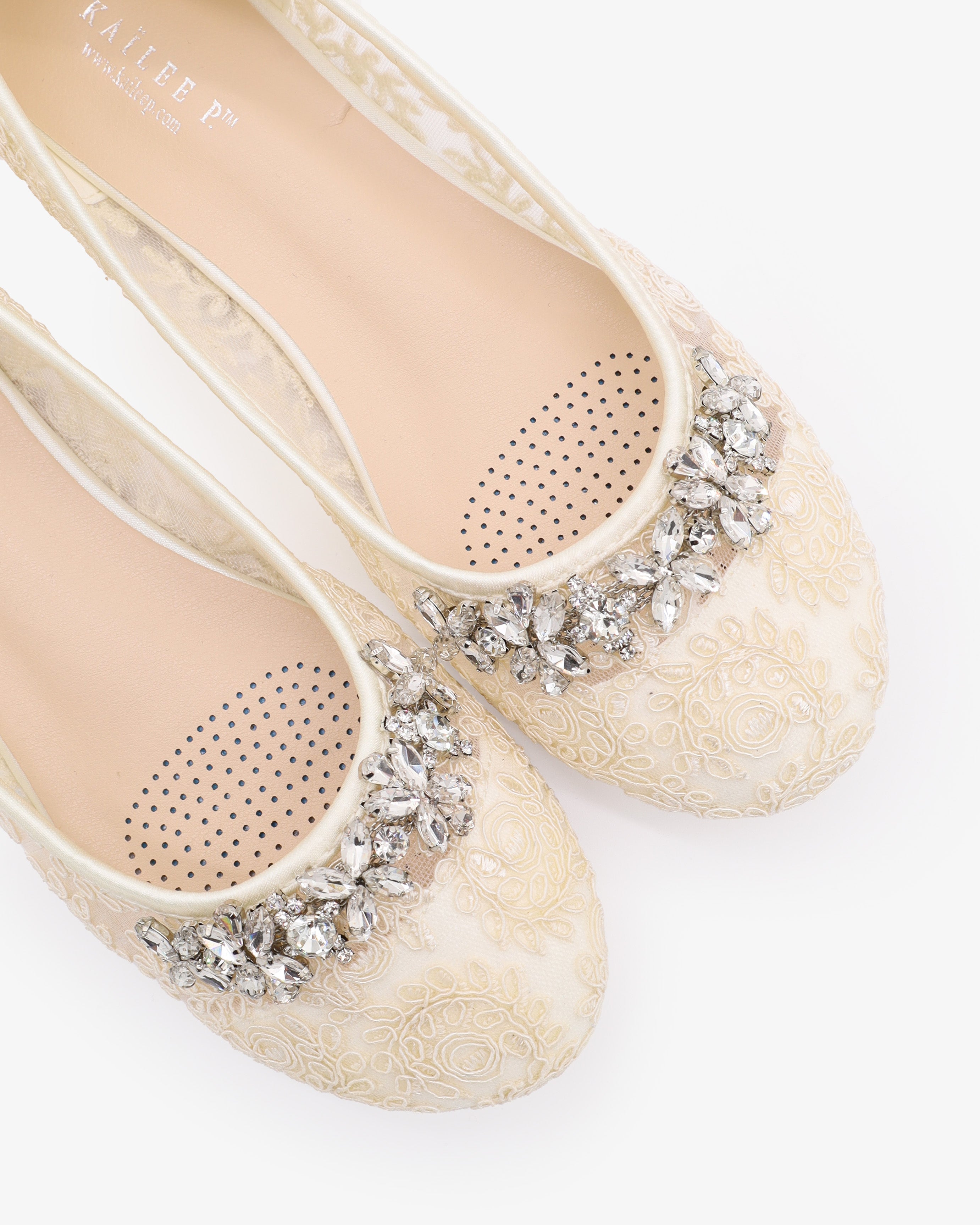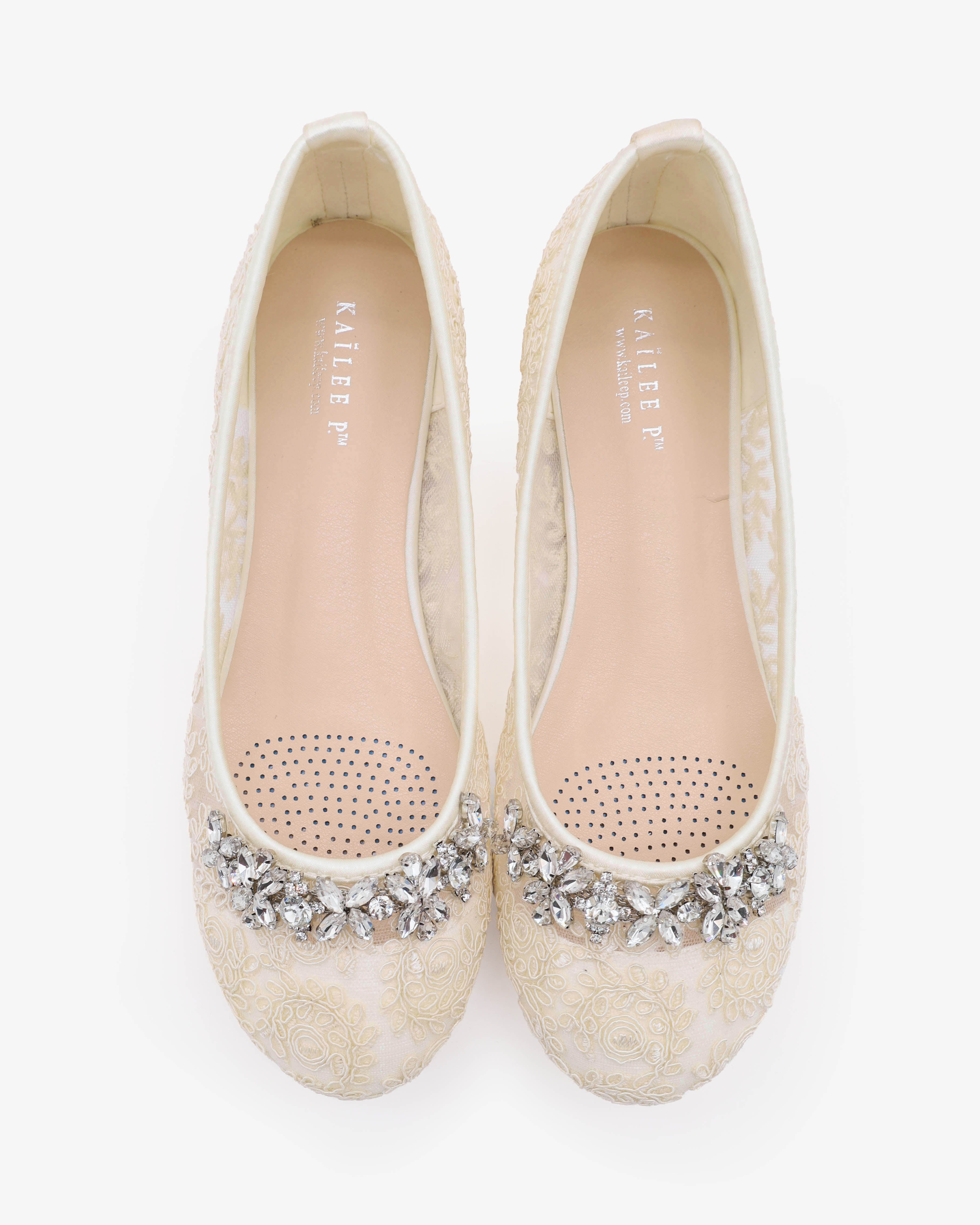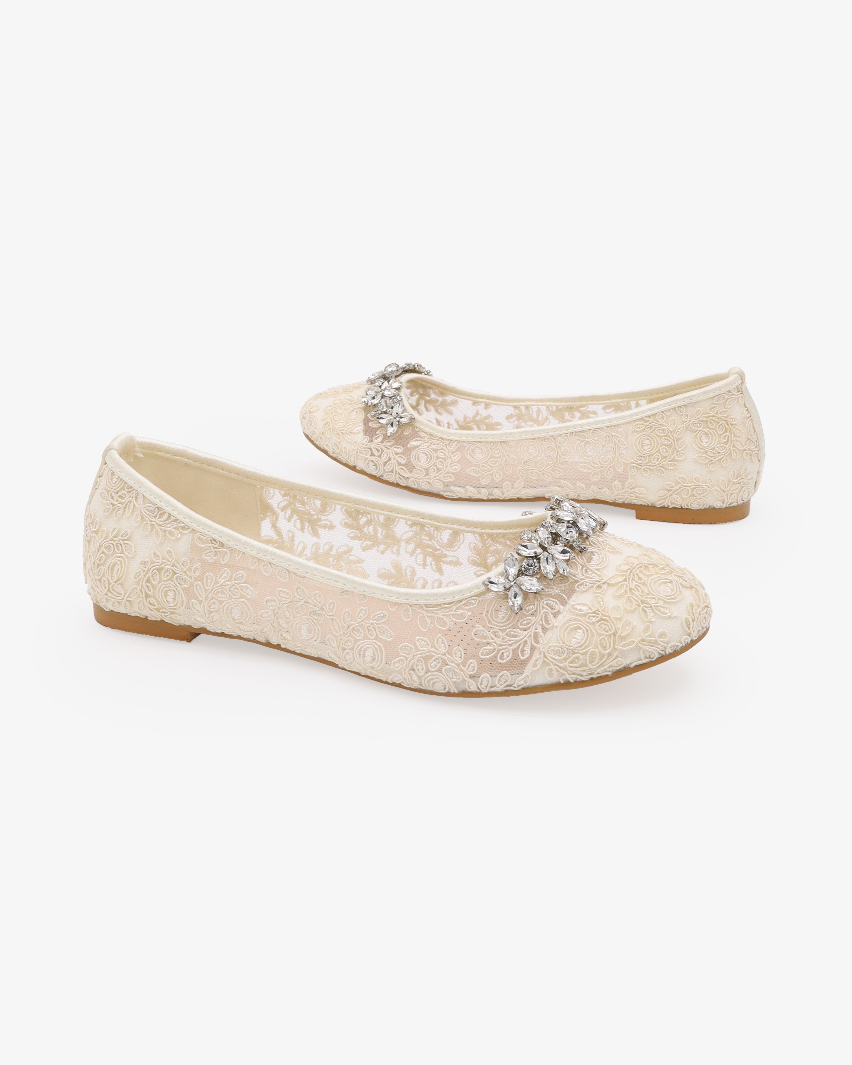 Add a touch of elegance and romance to your special day with these bridal flats. Designed with delicate crochet lace and floral rhinestones embellishments, these shoes adds a sparkle yet feminine look that complements wedding gowns, bridesmaid dresses, and bridal party ensembles.