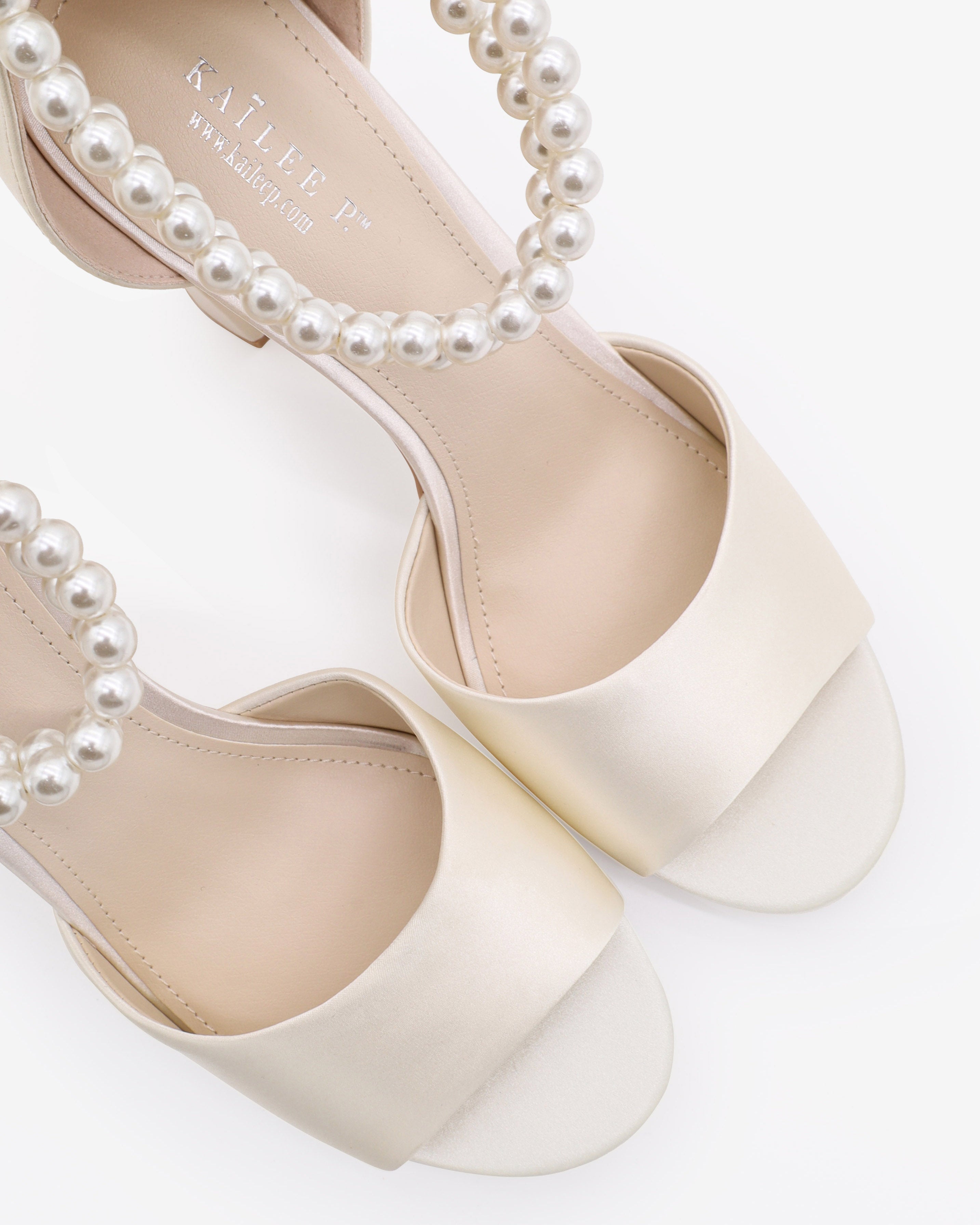 Satin block heel wedding sandals with double pearl ankle strap. Elegance and classic inspired wear for your special day. Perfect for brides, bridesmaids, prom night, date night, and definitely a highlight on every special occasions.