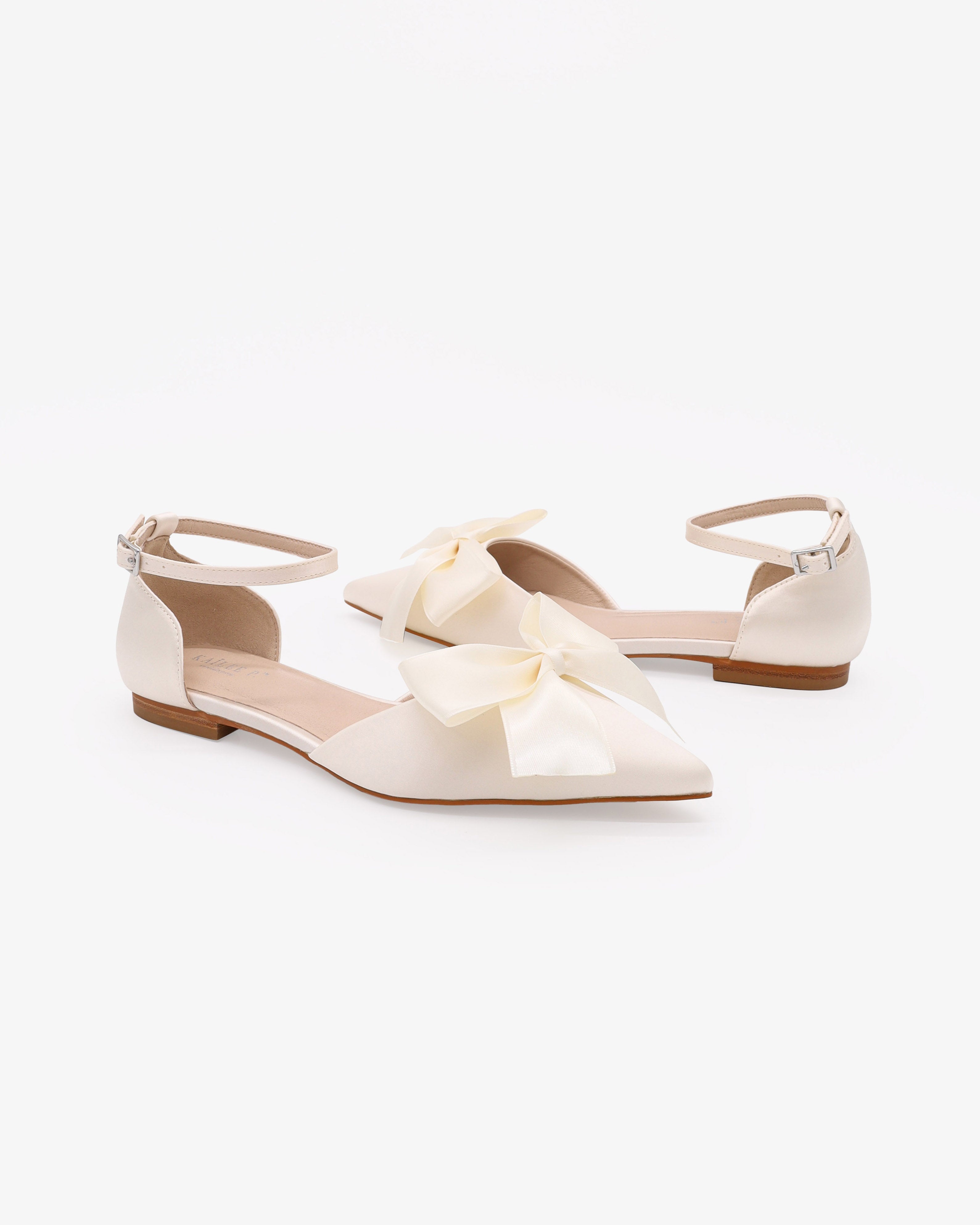 Satin pointy toe flats with satin bow on vamp. Comfortable throughout your special day and perfect for holiday party, night out and wedding party.