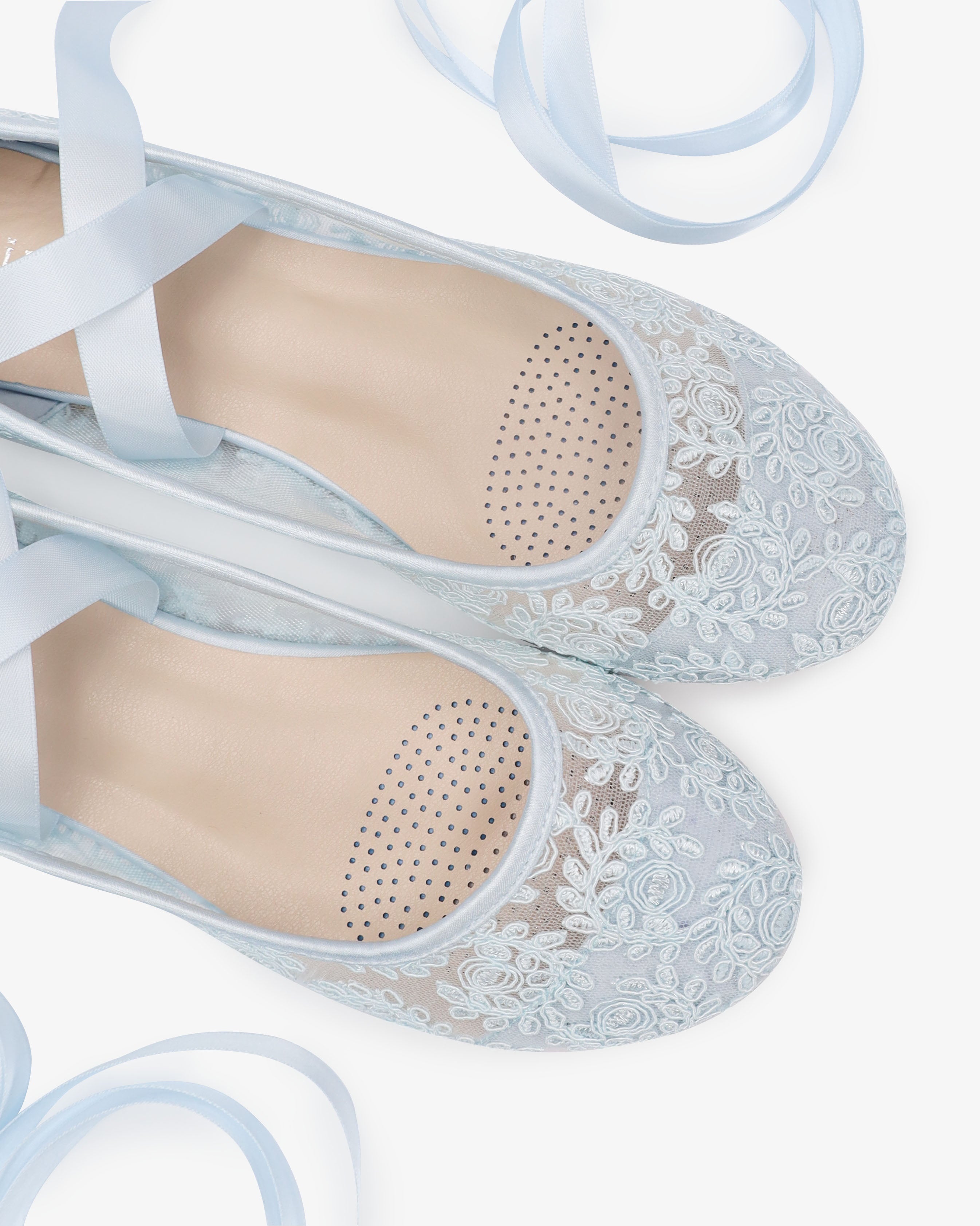 Add a touch of elegance and romance to your special day with these bridal flats. Designed with delicate crochet lace and adorned with a graceful ballerina lace up. These shoes offer a statement look and perfect for wedding gowns, bridesmaid dresses, and bridal party ensembles. The cushioned flat sole makes it comfortable for walking down the aisle, wedding receptions, bridal showers, engagement photos, and all-day celebration.