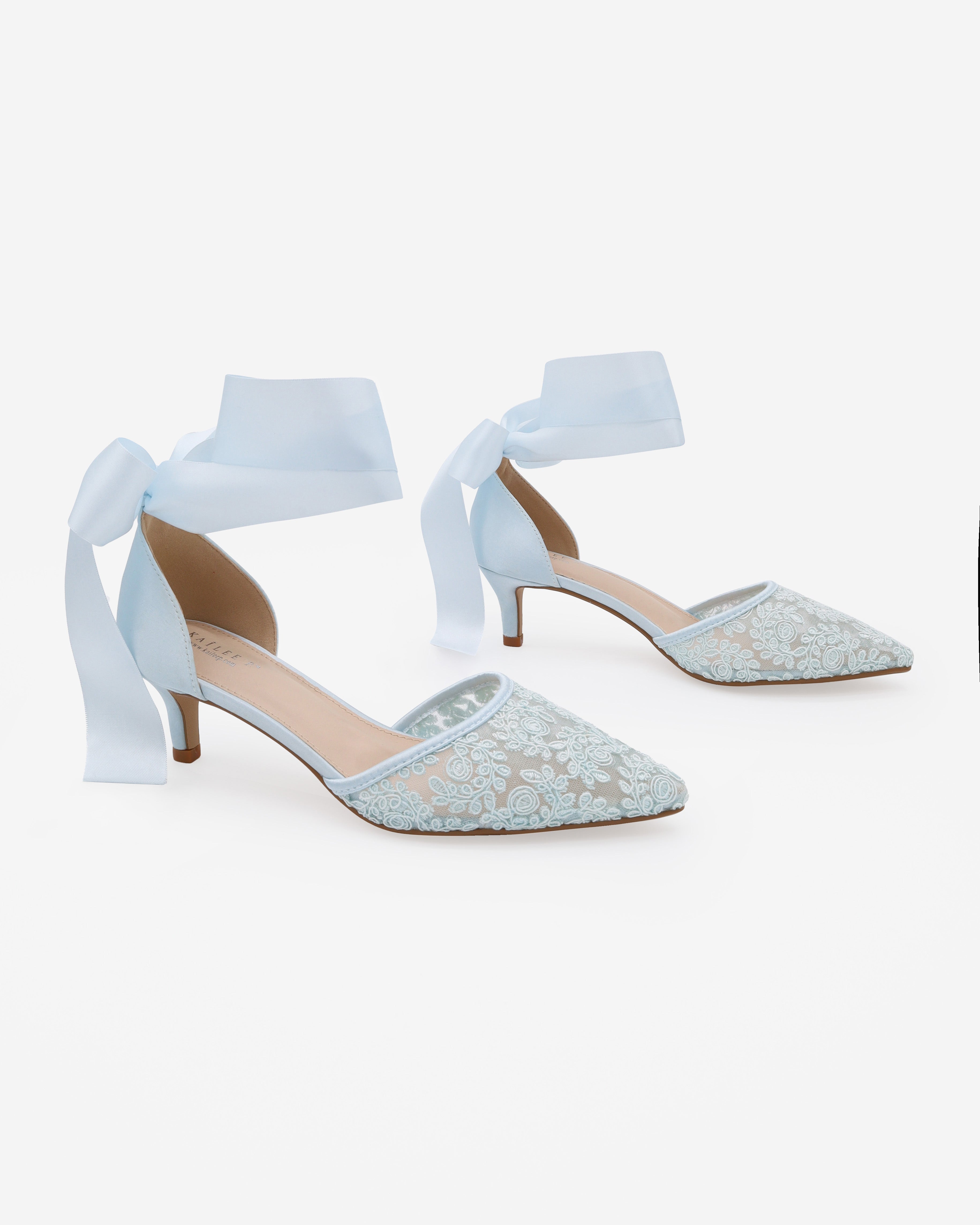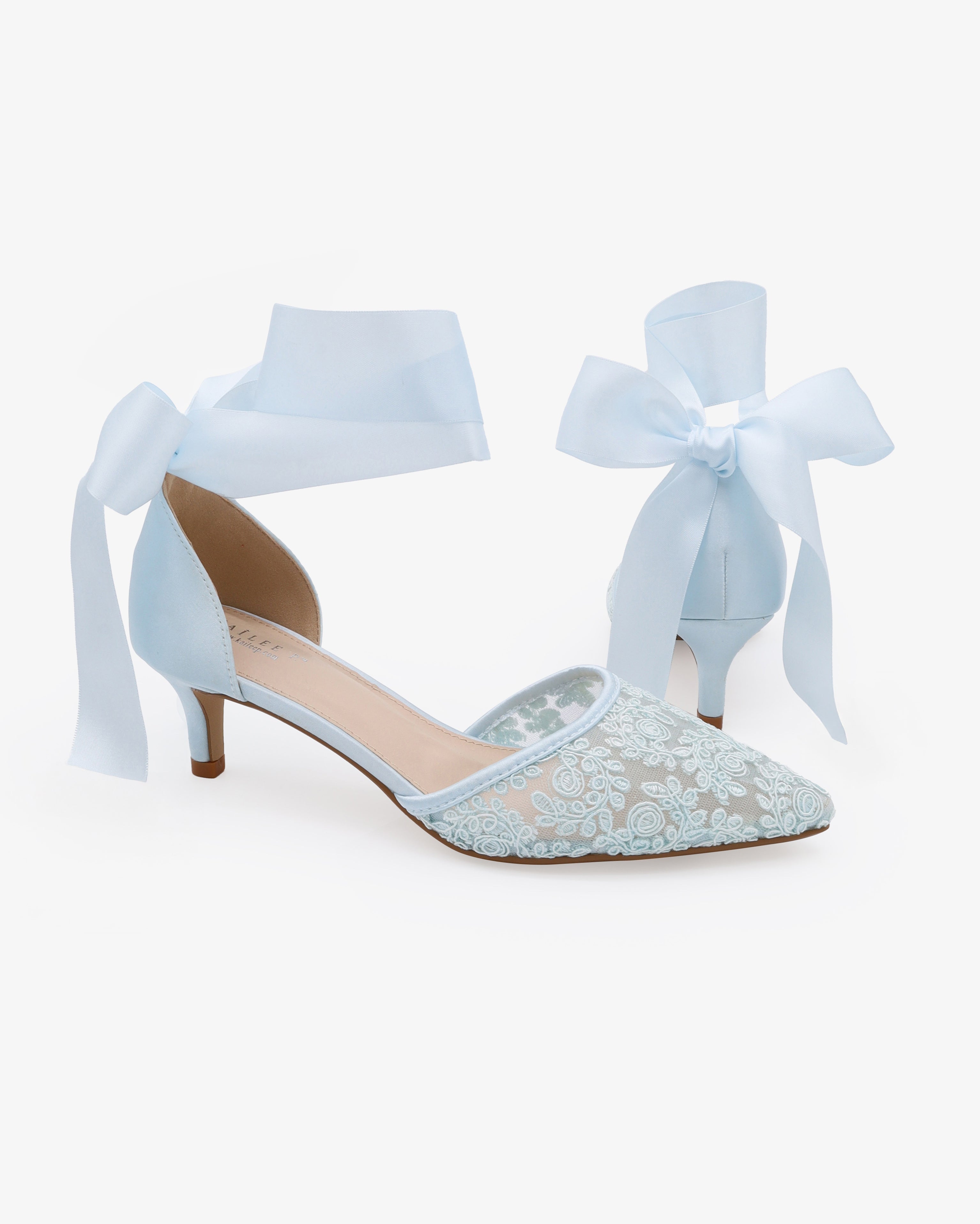 Crochet Lace Pointy Toe Wedding Kitten Low Heel with Wrapped Ankle Tie