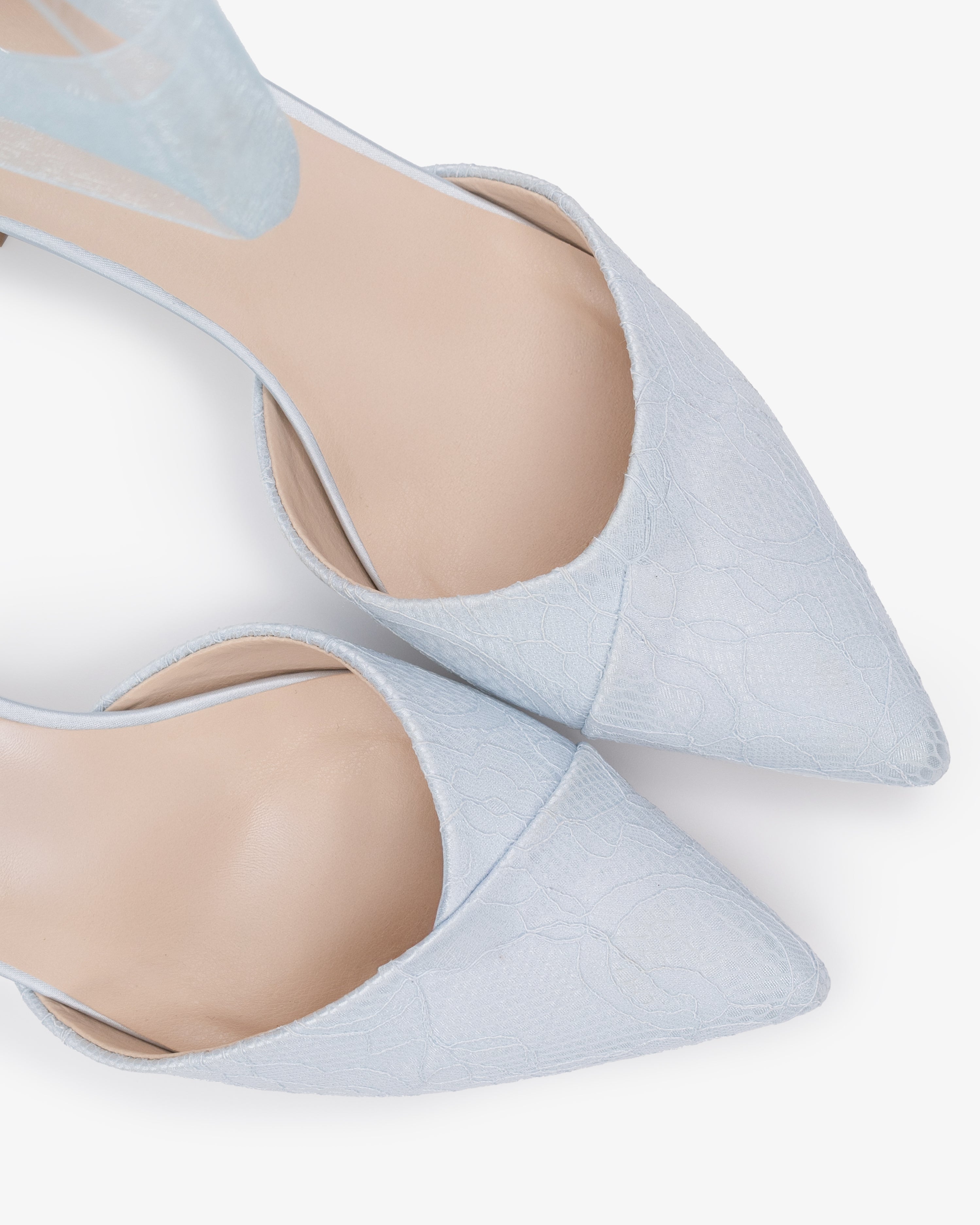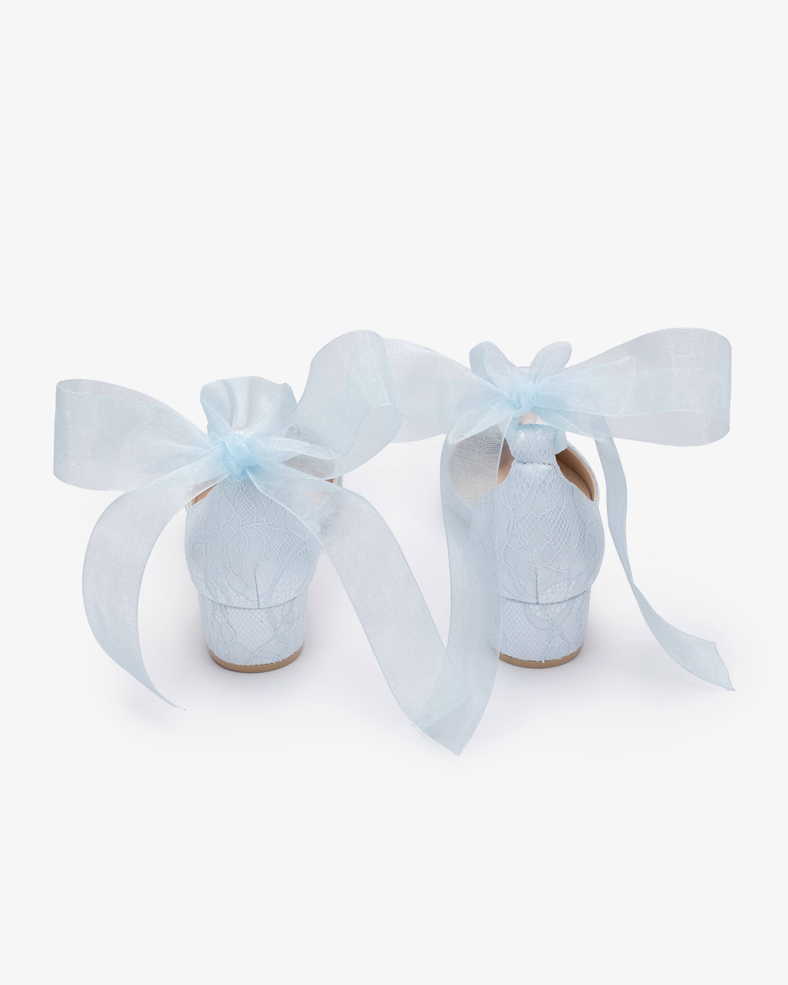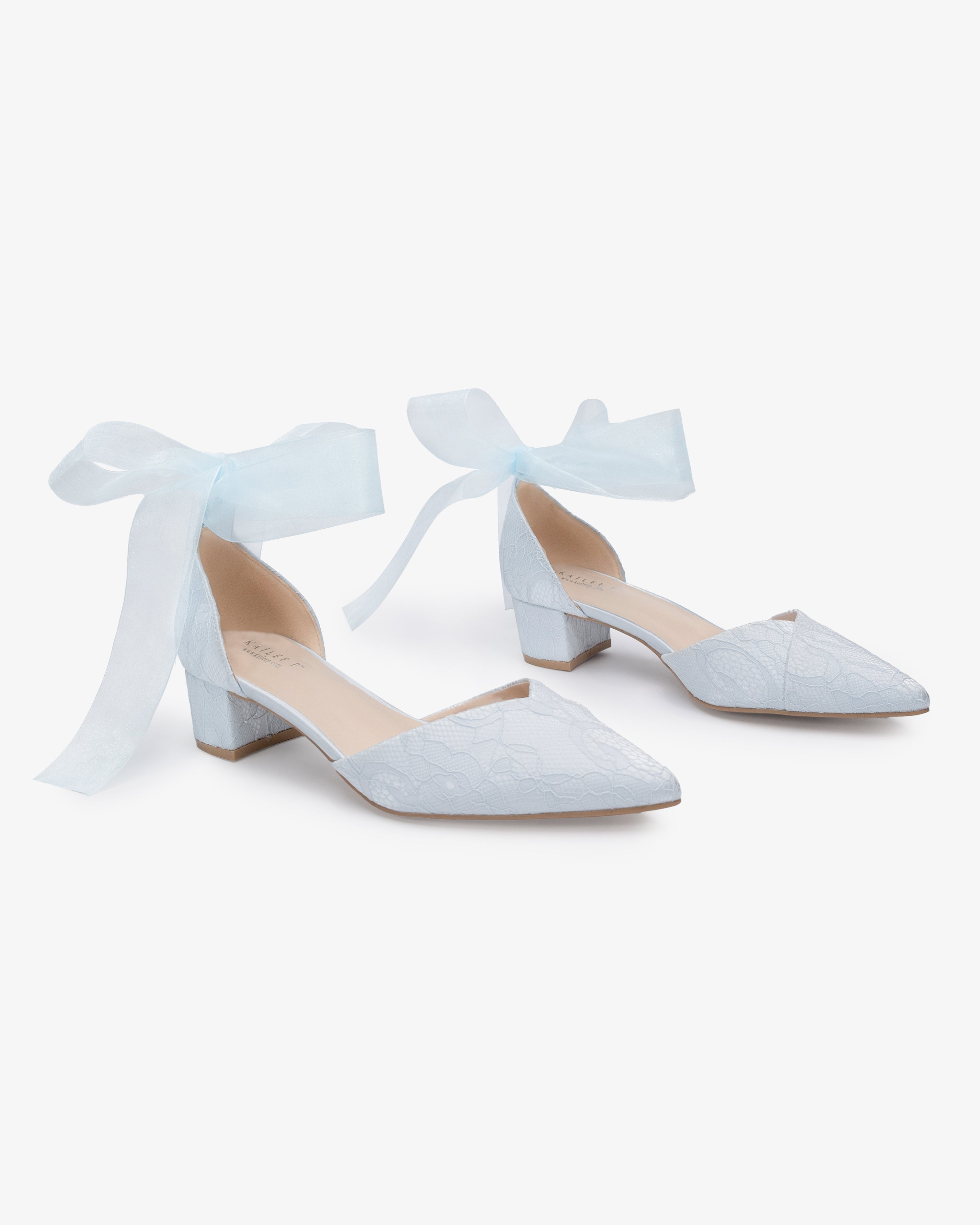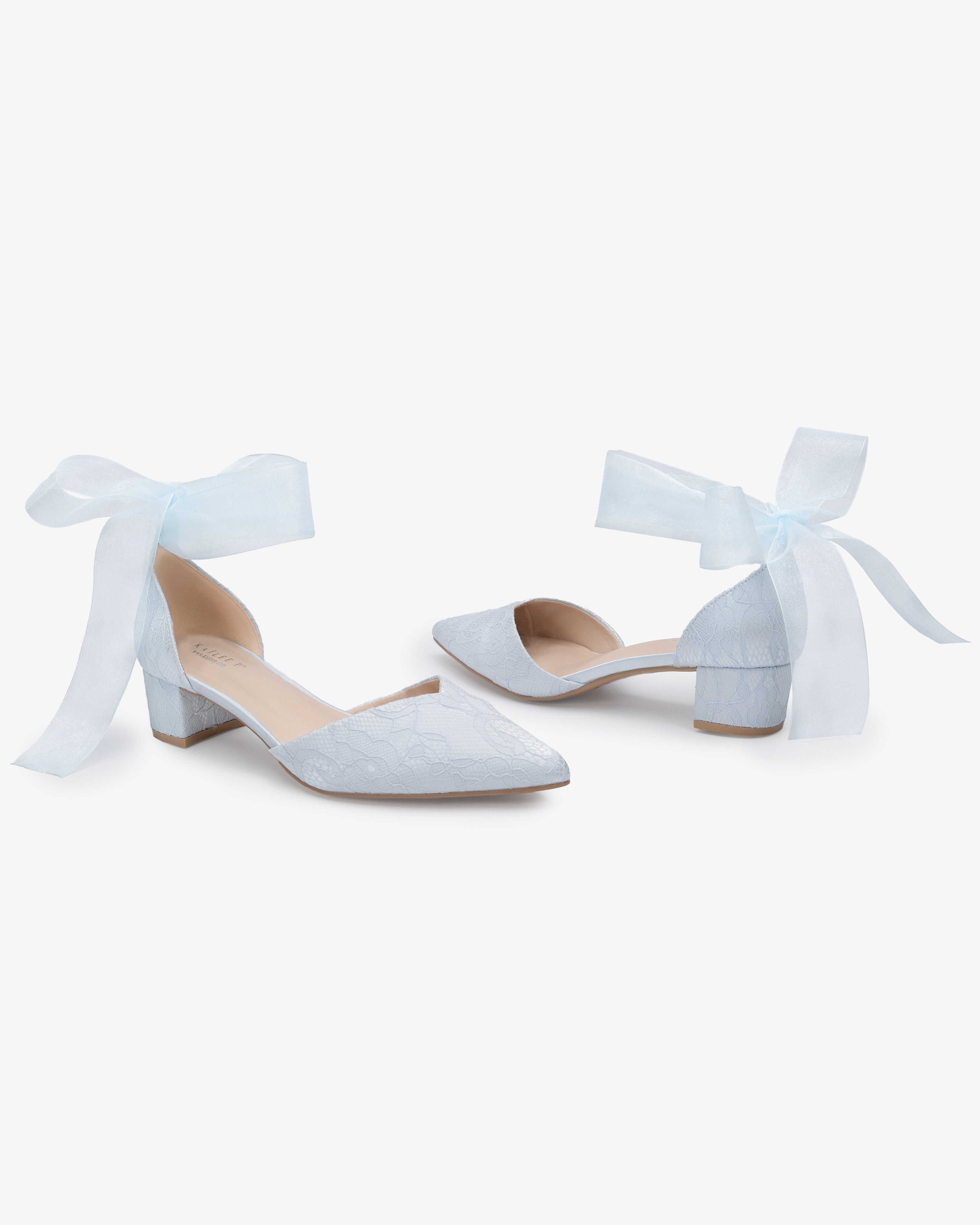 Step into bold elegance with these lace pointy toe low block heels. Adorned with matching satin or sheer ribbons that ties to an oversized bow around ankle to add dancerly grace to any ensemble. These heels redefine sophistication with a touch of fearless charm, making them perfect for brides, bridesmaids, weddings, proms, parties, or other special events. The light blue color can easily be your something blue.