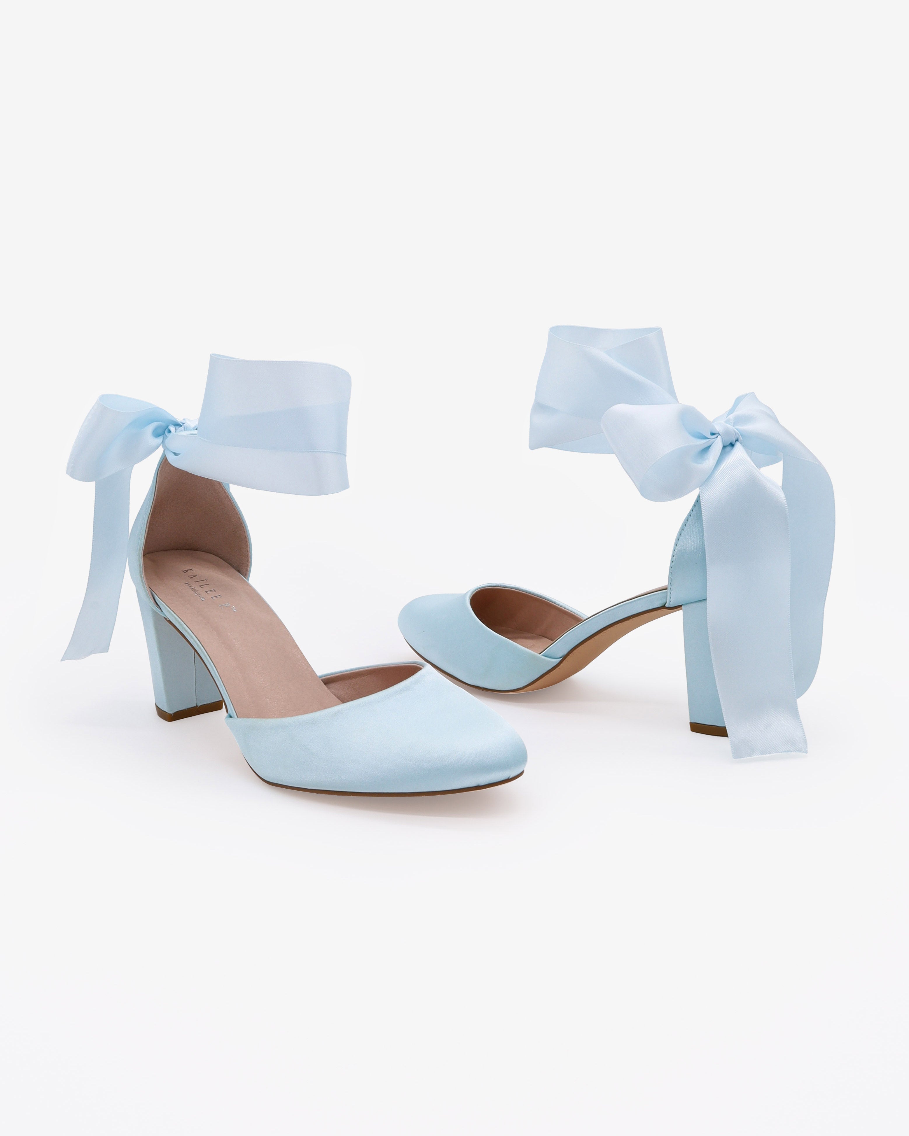 Satin block heel with satin ribbon ankle tie. Beautiful and yet looks fun and dramatic. Perfect for brides, bridesmaids, prom night, date night, holiday party, and any special occasions.