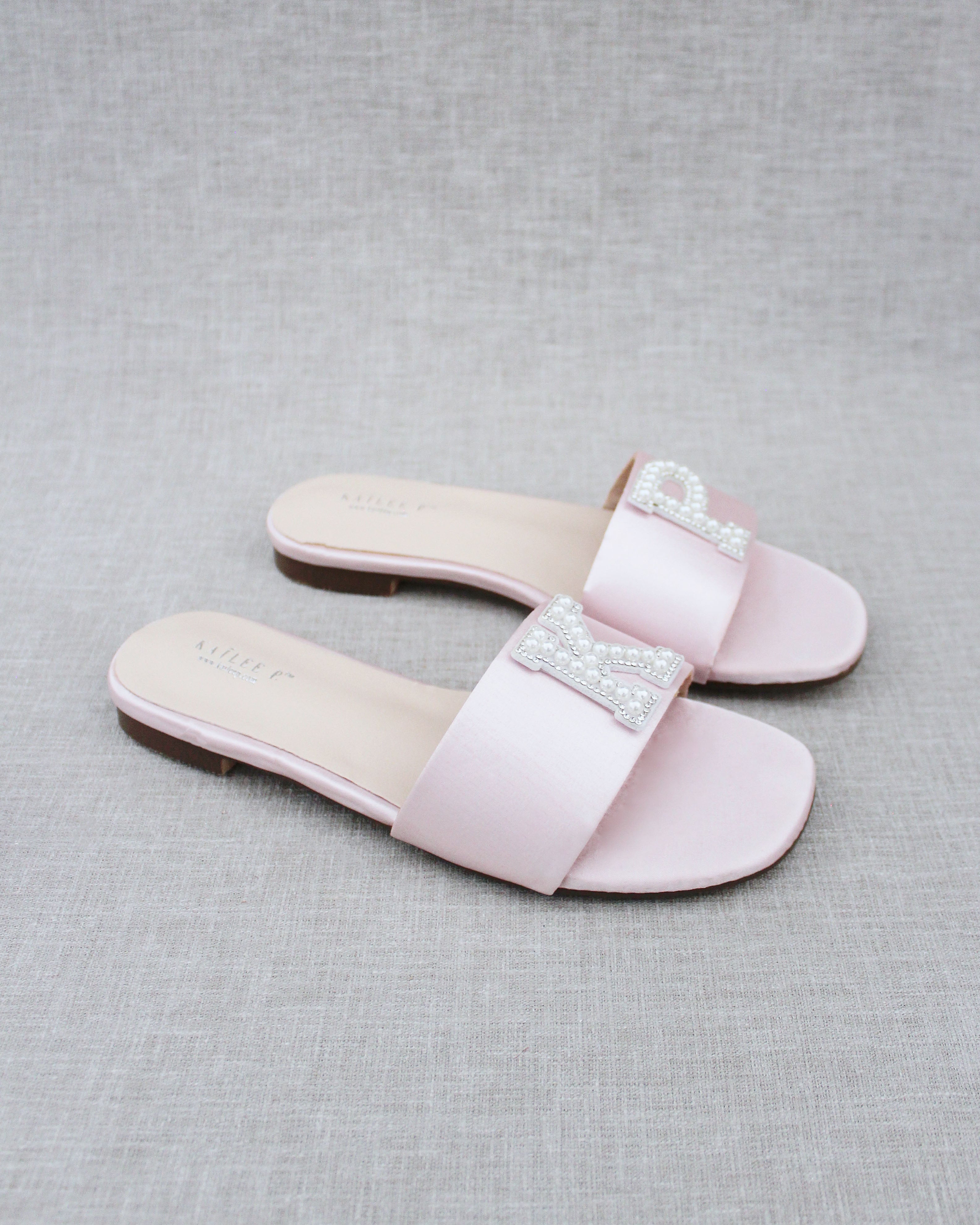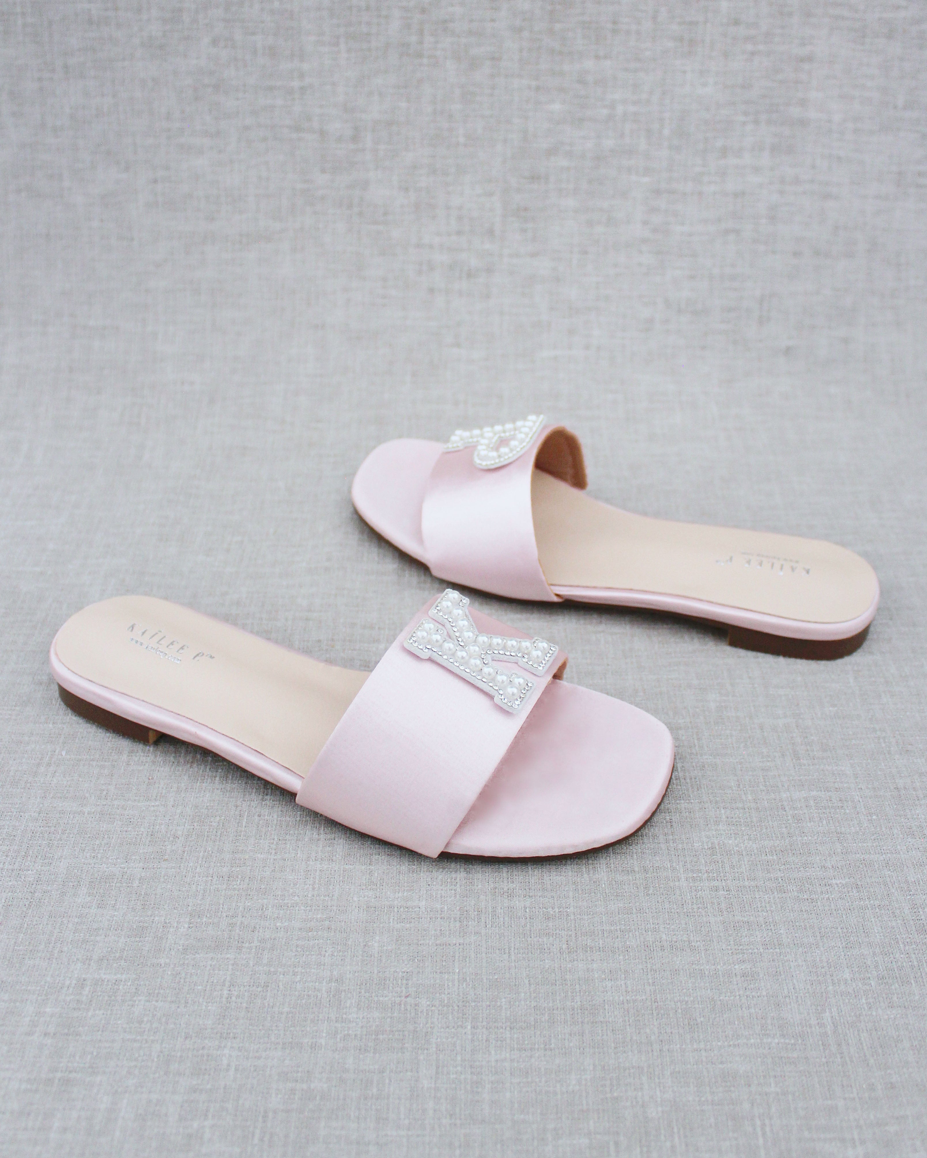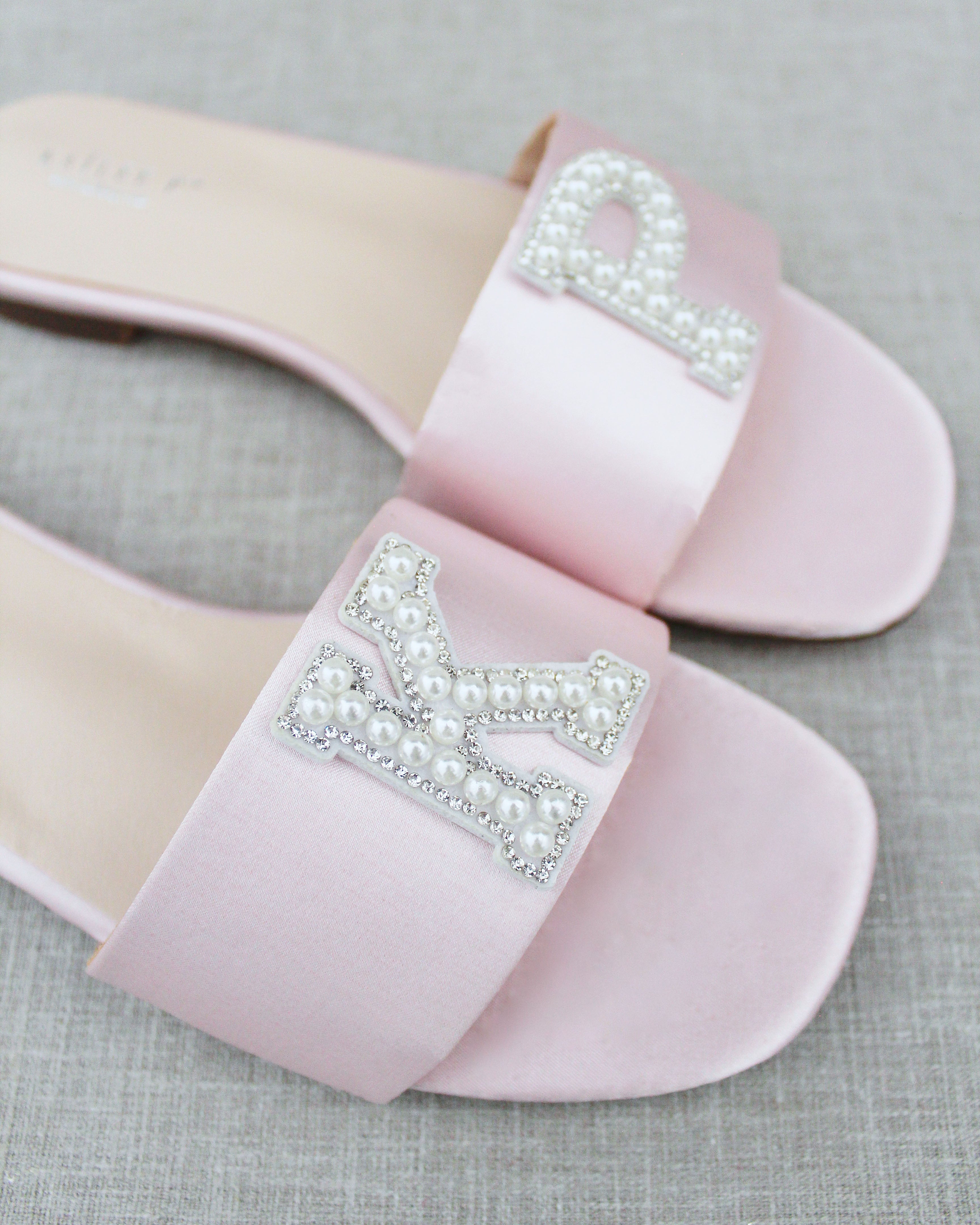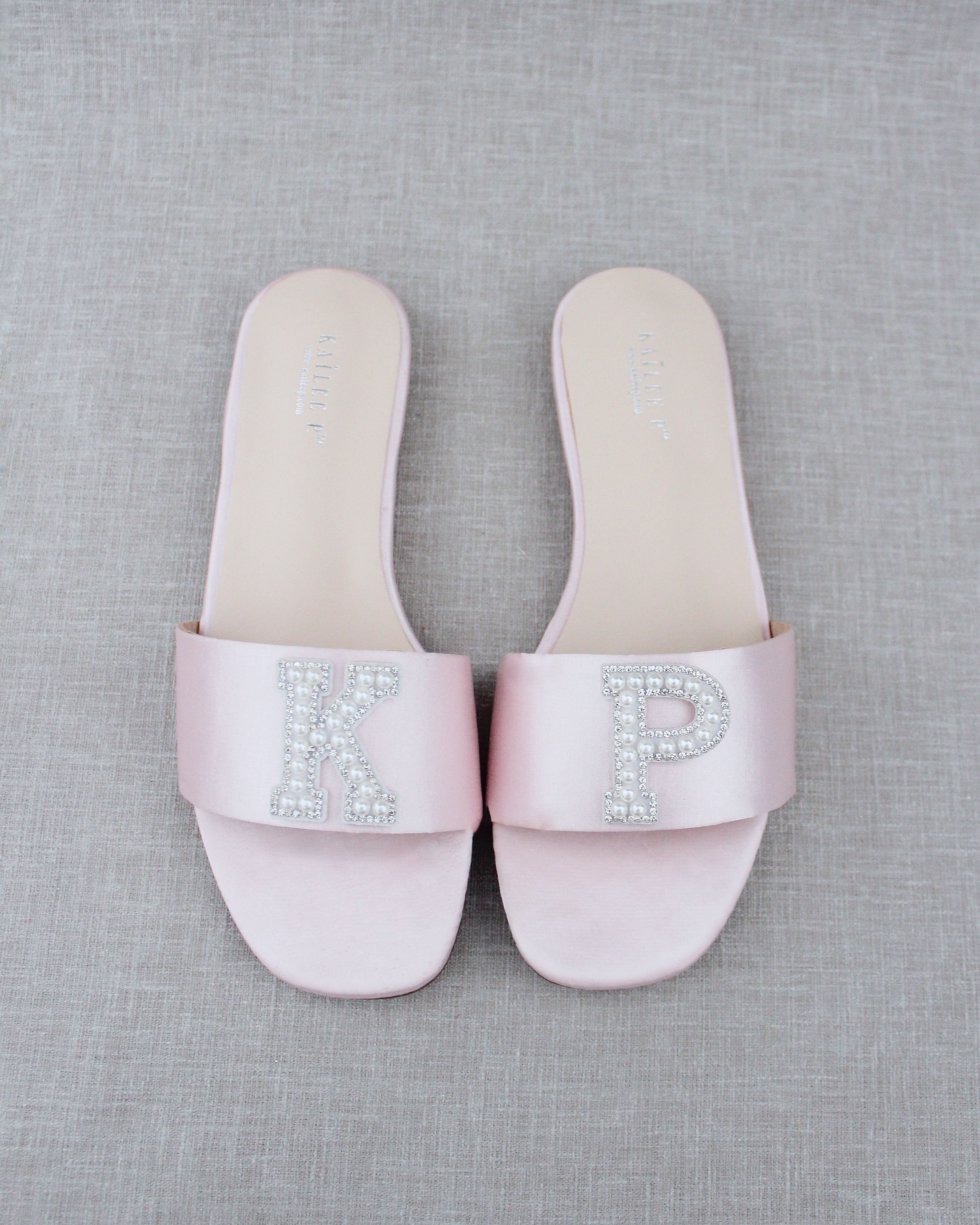 Classic slide flat sandals with embellished personalized letter at your choice. It's perfect for getting ready on your wedding day, a bridesmaid gift or a comfortable wear to change into and dance the night away. Simple and easy wear for brides, bridesmaids and wedding parties.