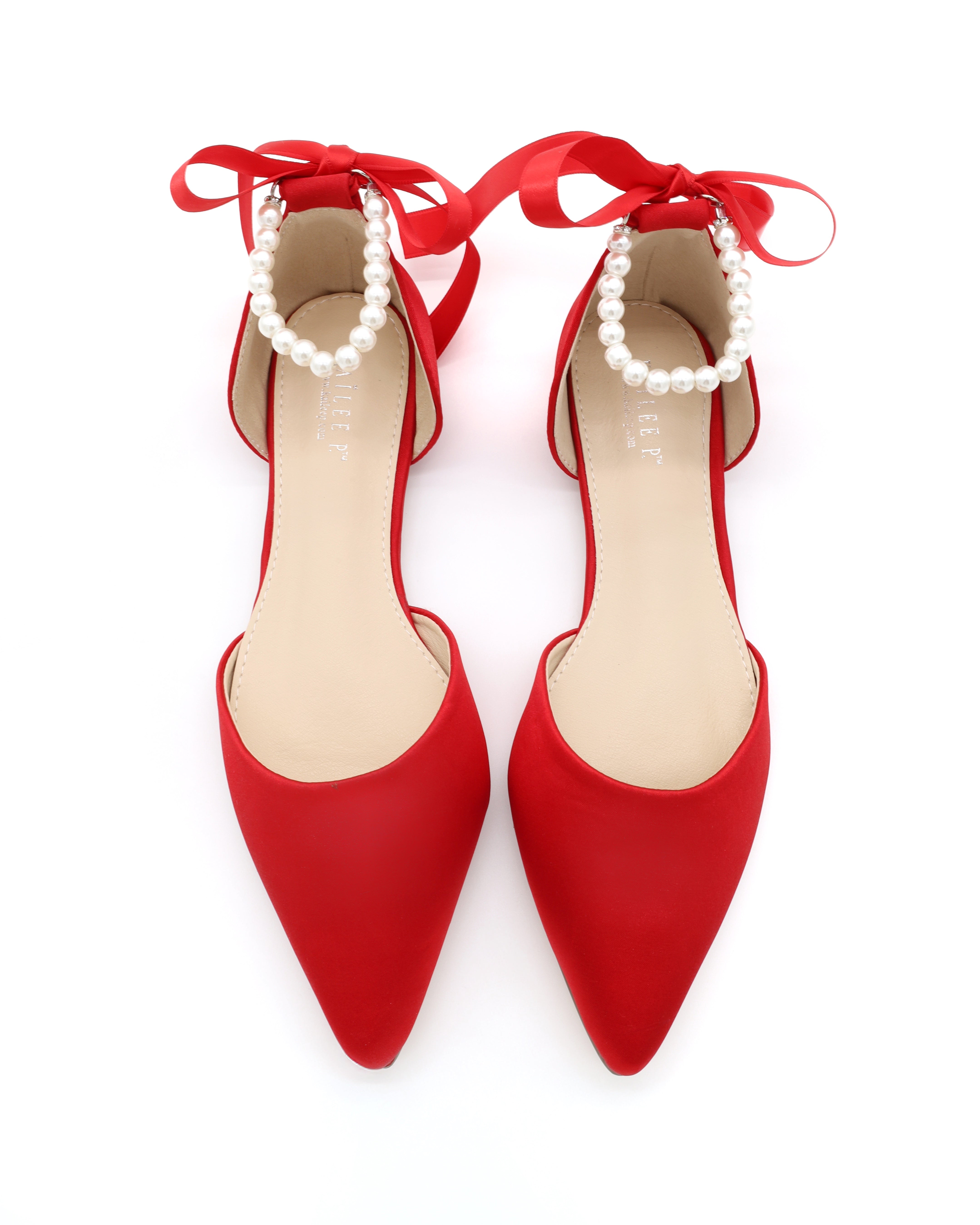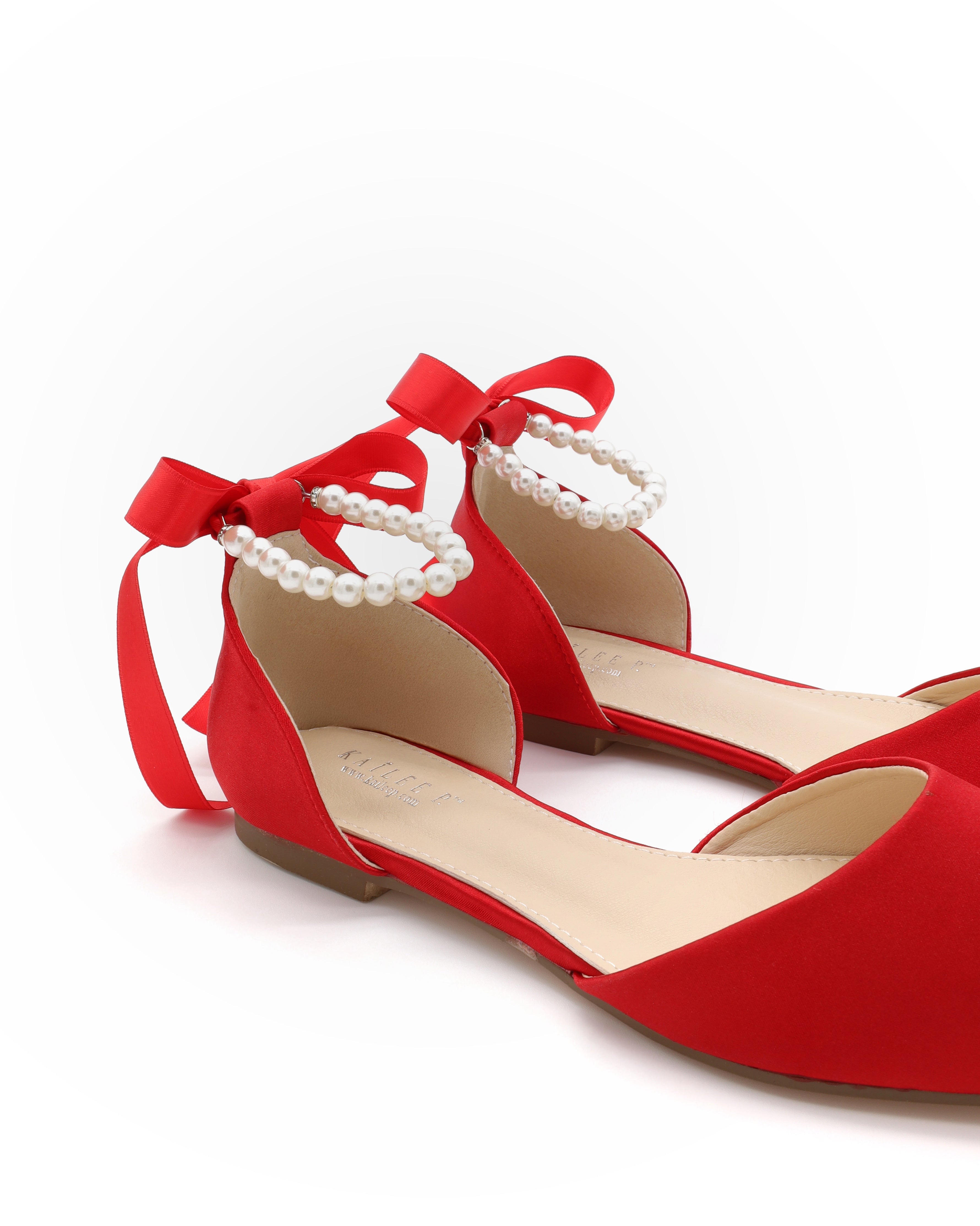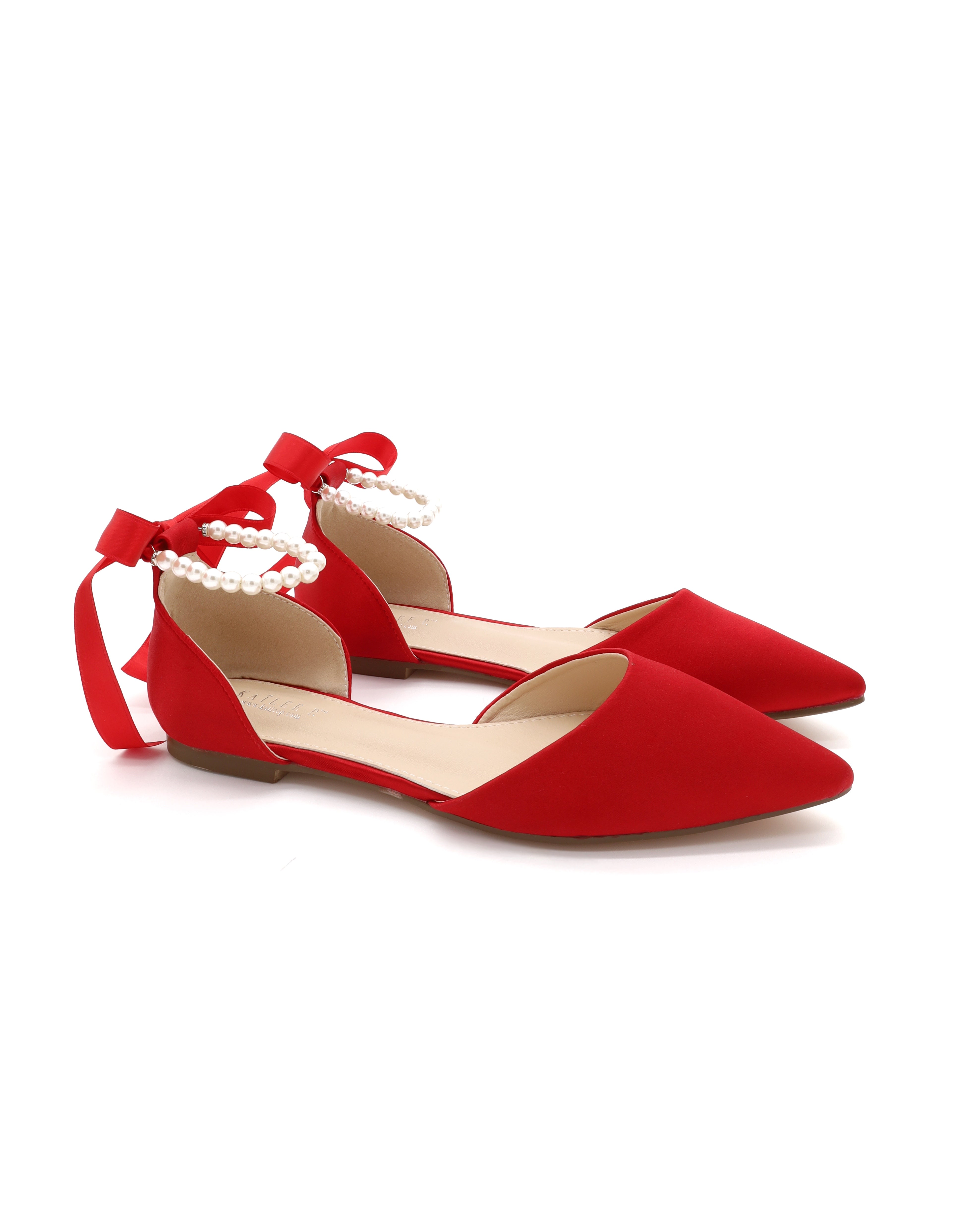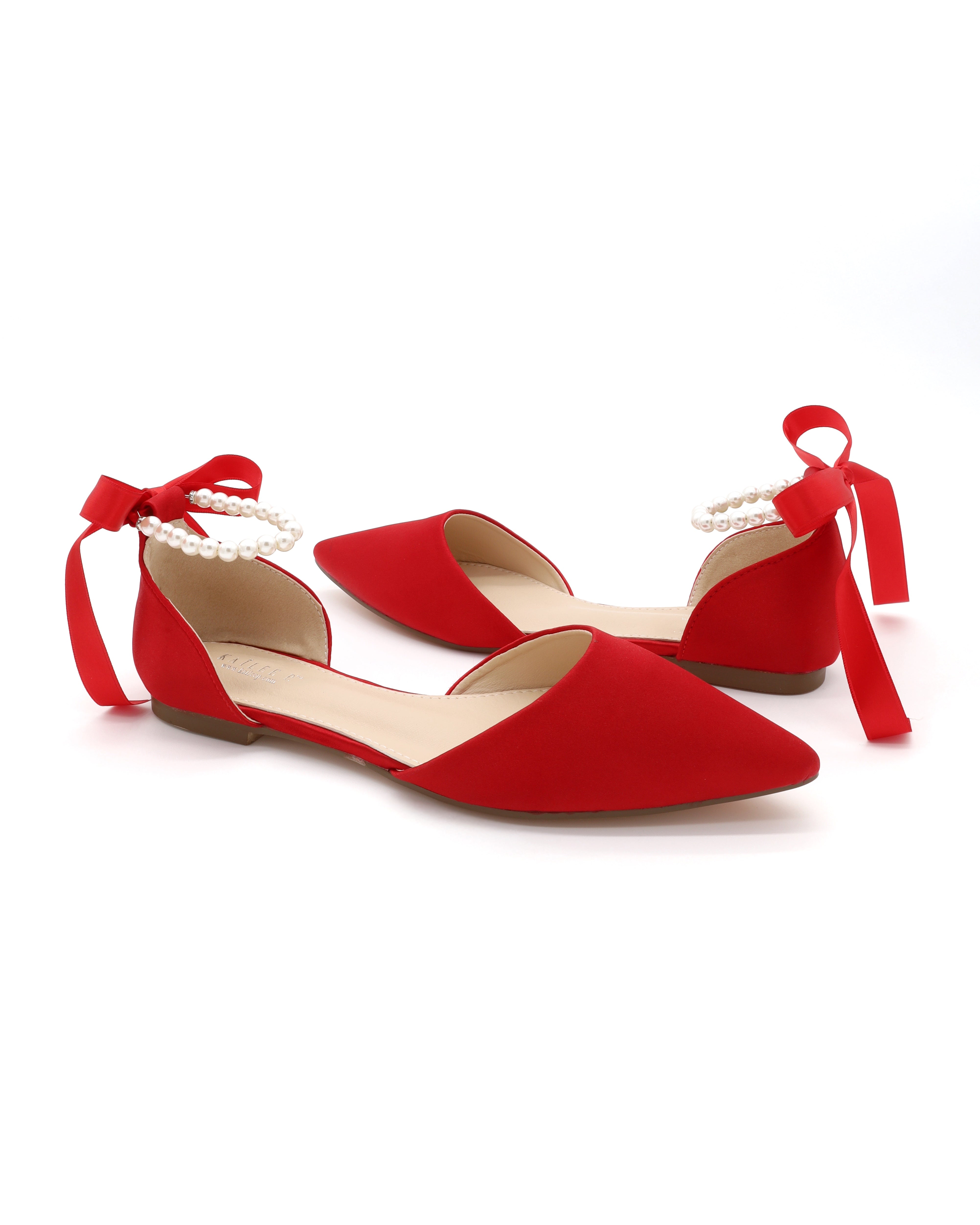 Satin Pointy Toe Bridal Flats with Ribbon Tie or Pearls Strap