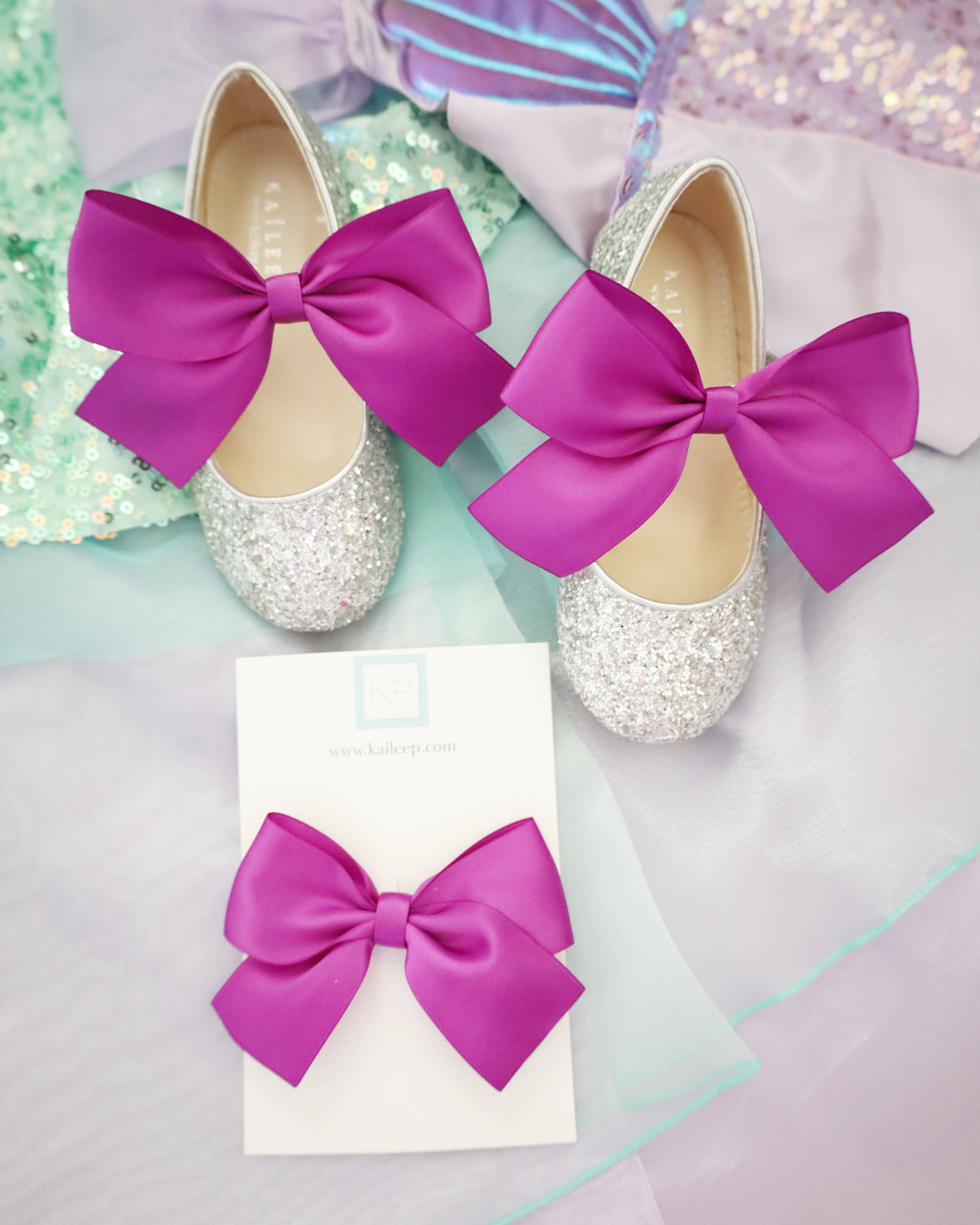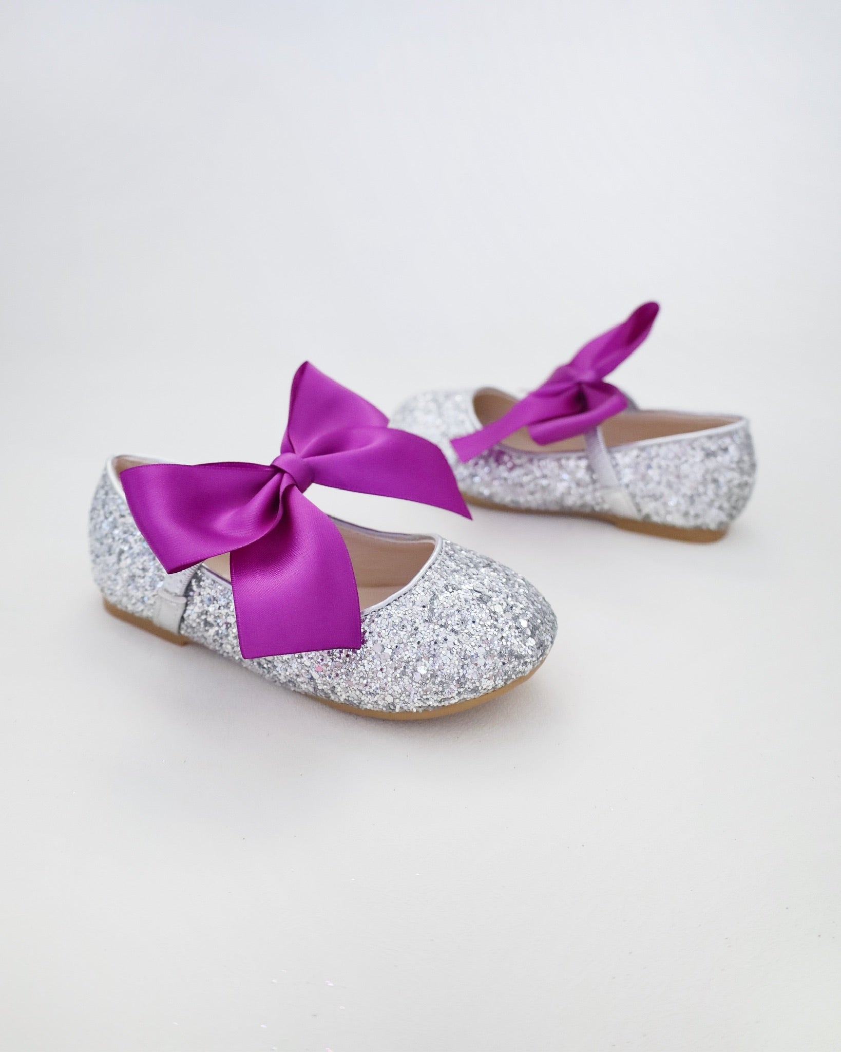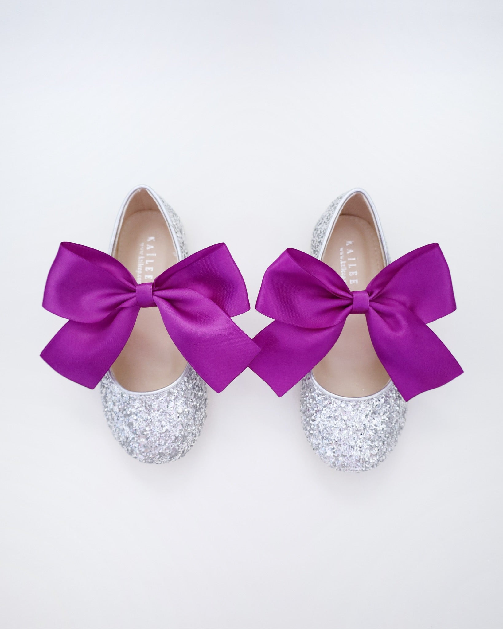 Enhance your child's fairytale look with these mary jane kids' glitter shoes, perfect for costume-inspired outfits and Halloween. Featuring bold, teal or violet satin bow colors and a glittery finish, these shoes are ideal for pairing with princess costumes or special event outfits. Comfortable and stylish, they’re the perfect match for trick-or-treating, costume parties, or any magical occasion where a standout look is needed.