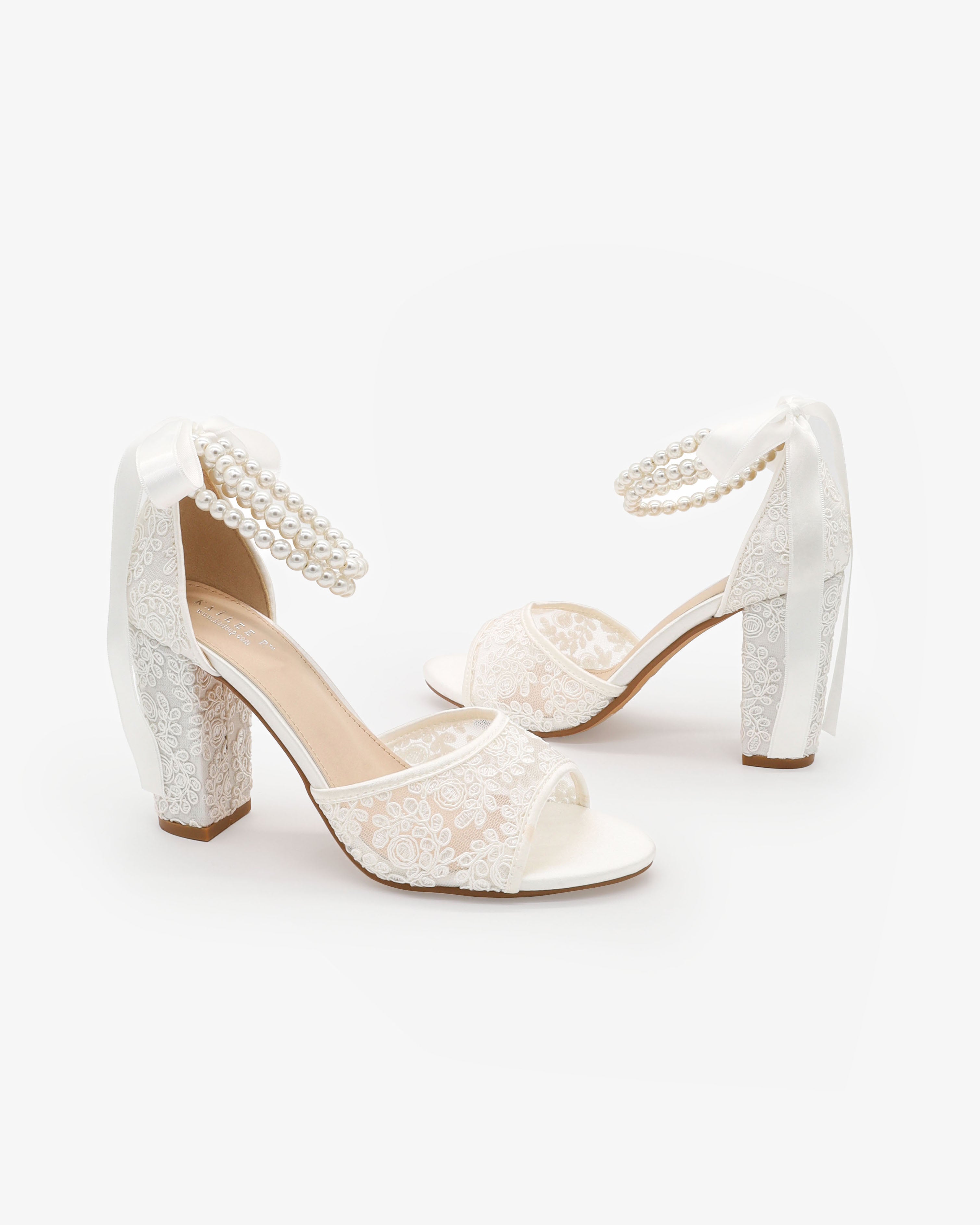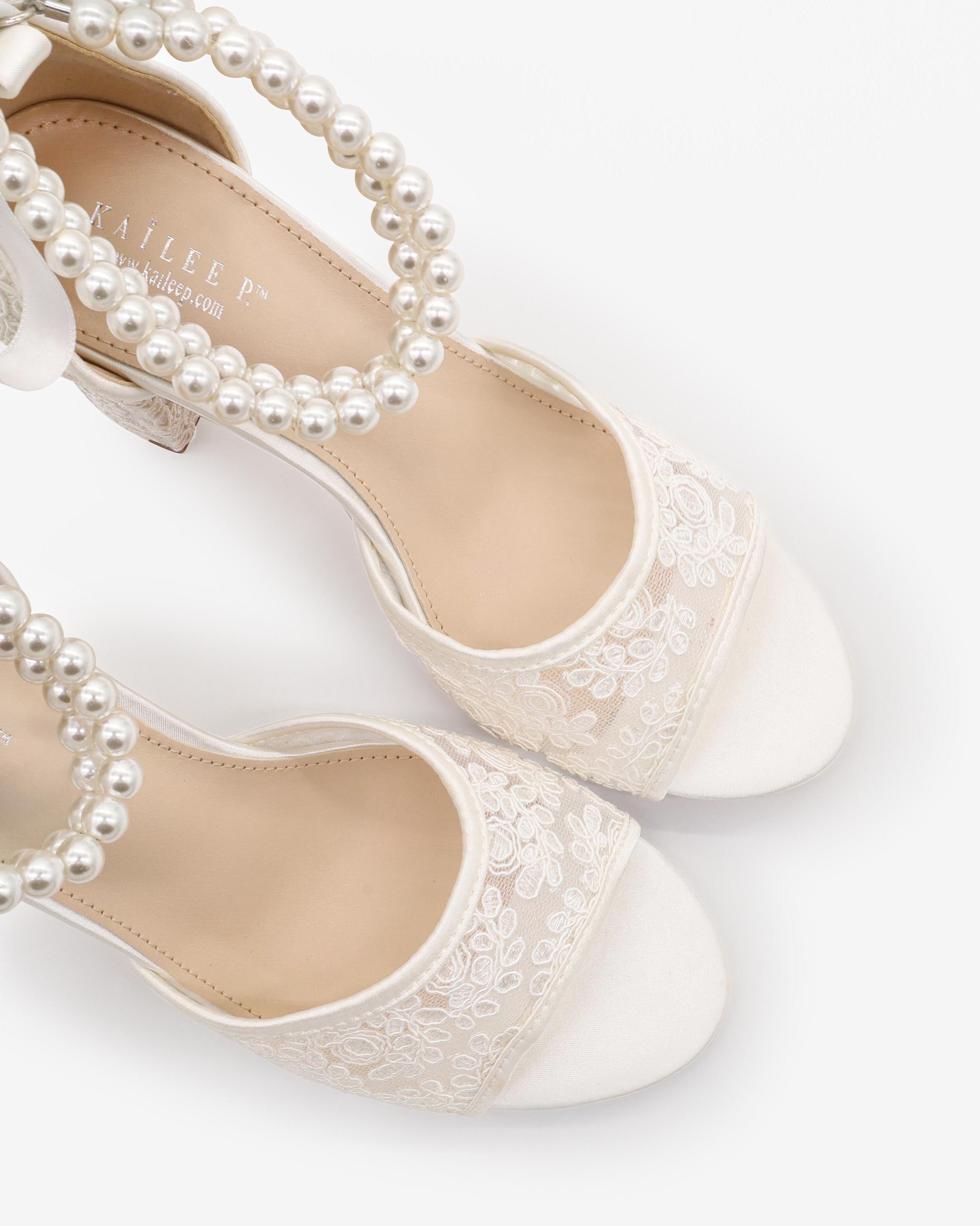 Fun and flirty block heel sandals in crochet lace with double pearl ankle straps. Elegance and classic inspired wear for your special day.