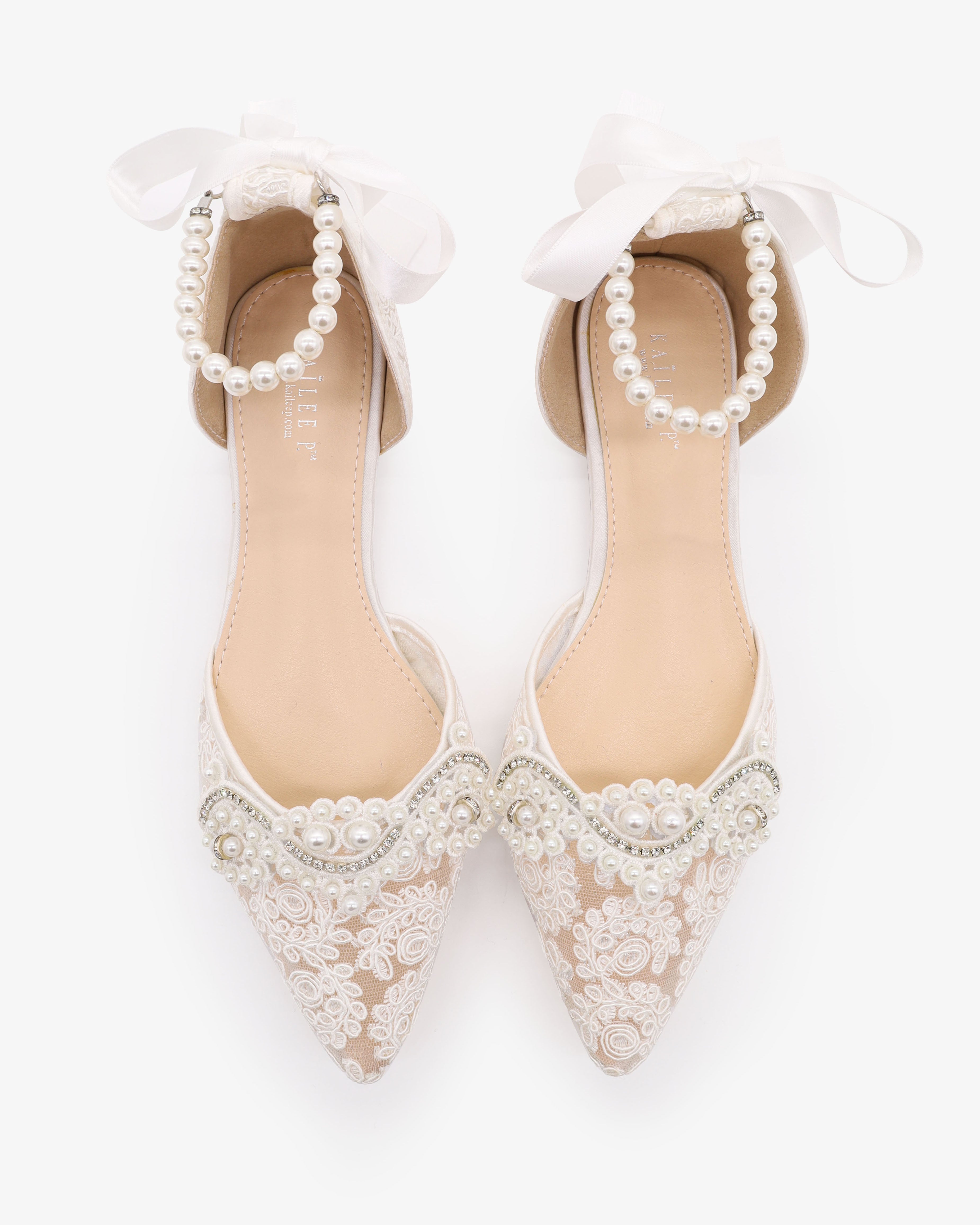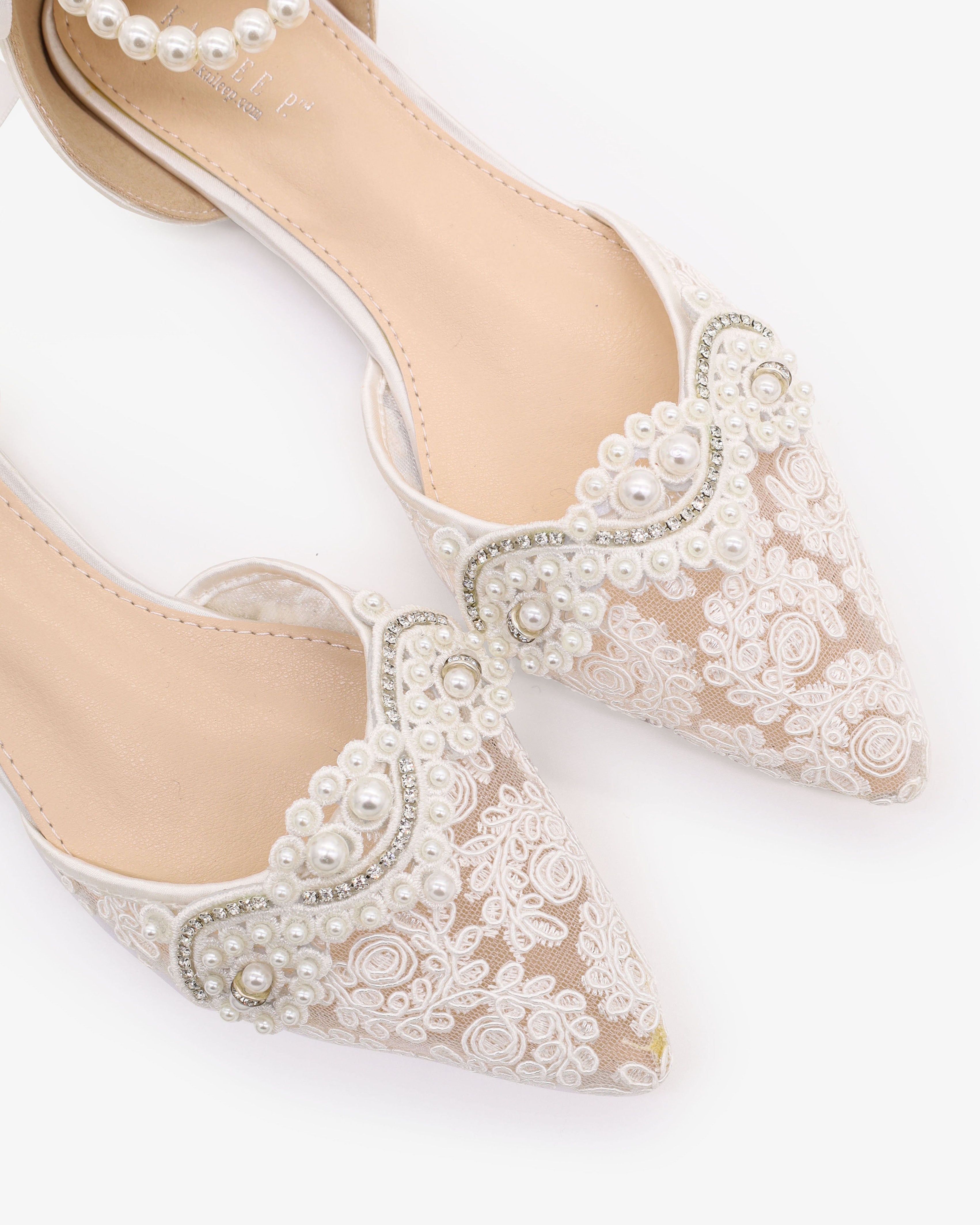 Pearls and rhinestones applique laid across top line of crochet lace pointy toe flats with ankle strap. Vintage inspired meets classic glam. Perfect for brides, bridal party, bridesmaids, prom, parties, or any special occasion.