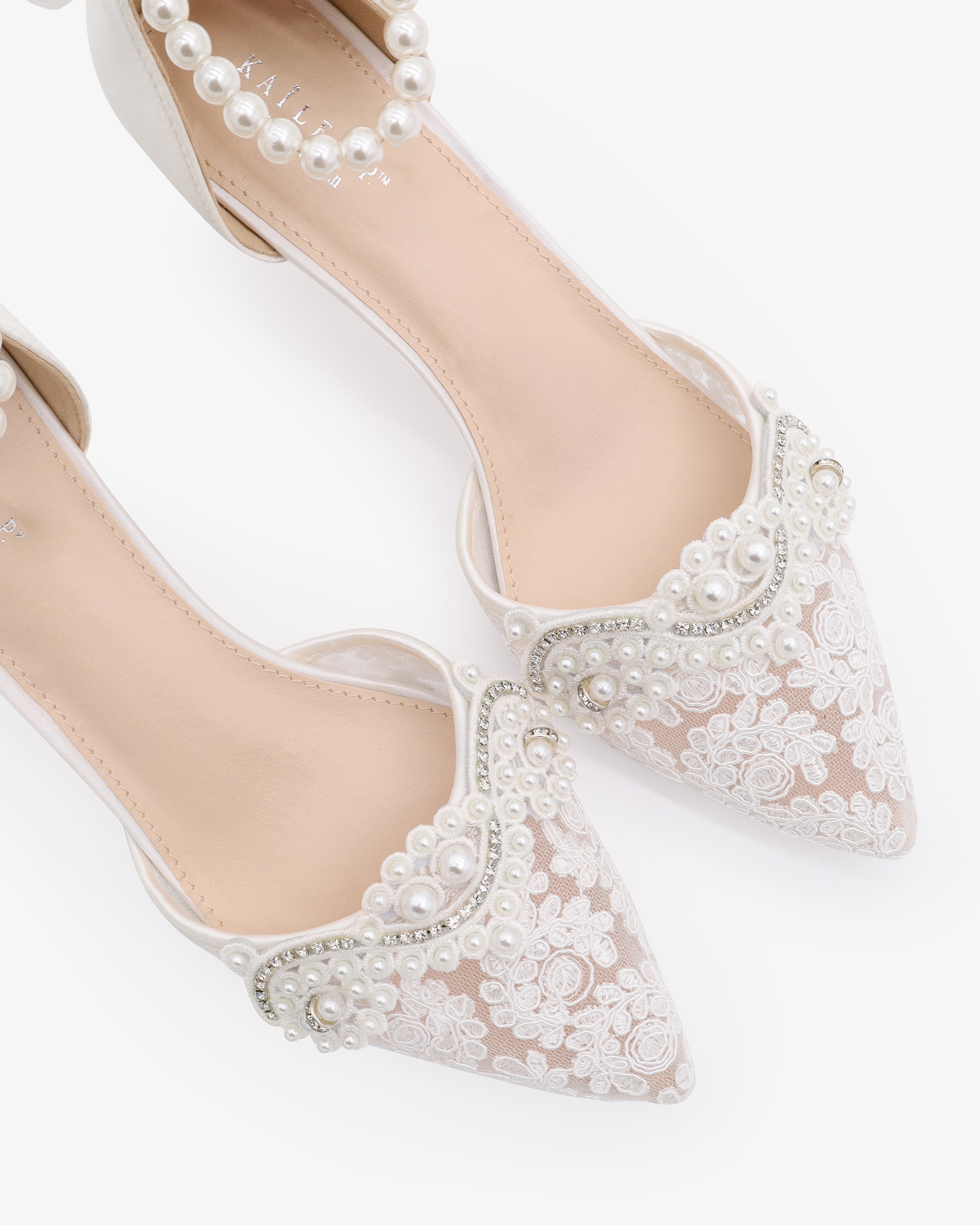 Crochet Lace Pointy Toe Wedding Kitten Low Heel with Mini Pearls