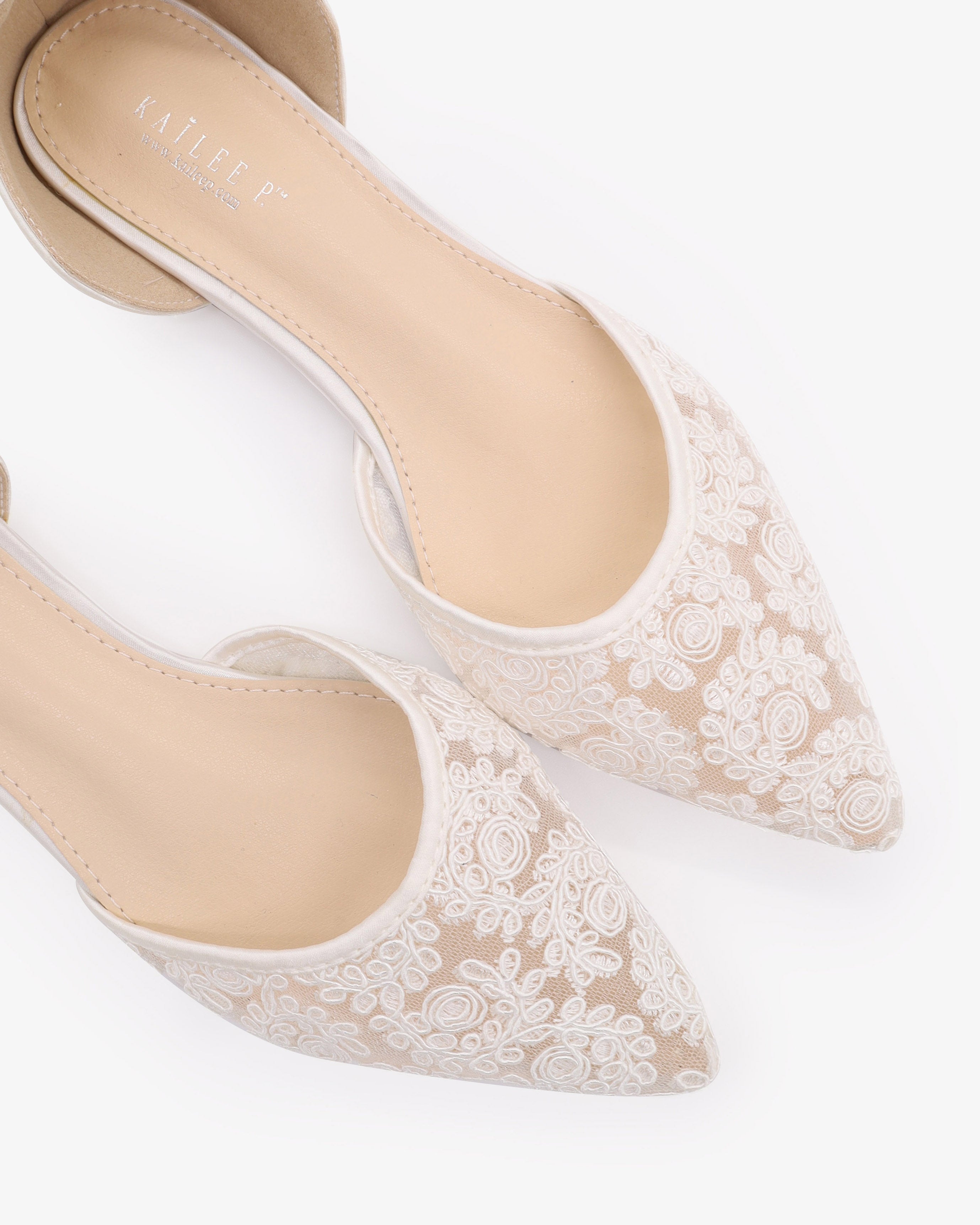 Crochet lace pointy toe flats for comfortable wear throughout your special day and perfect for wedding party. We've added satin or sheer organza lace up ribbon to make this a ballerina shoe.