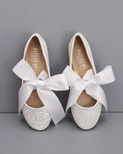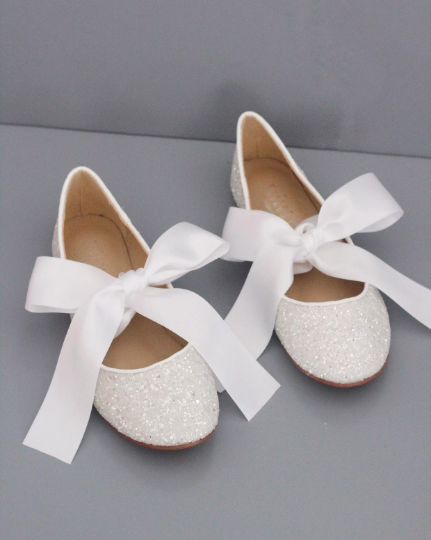 Inspired by a contemporary and refined designed ballet flat. The sparkly rock glitter adds the perfect dazzle and shine to these round toe flats. Style as a lace up traditional ballet slipper (ballerina) or delicately loop the ribbons around the ankle and tie into an oversized bow. Perfect for evening shoes, bridesmaids, wedding parties, holiday party, formal wear, and any special occasion.