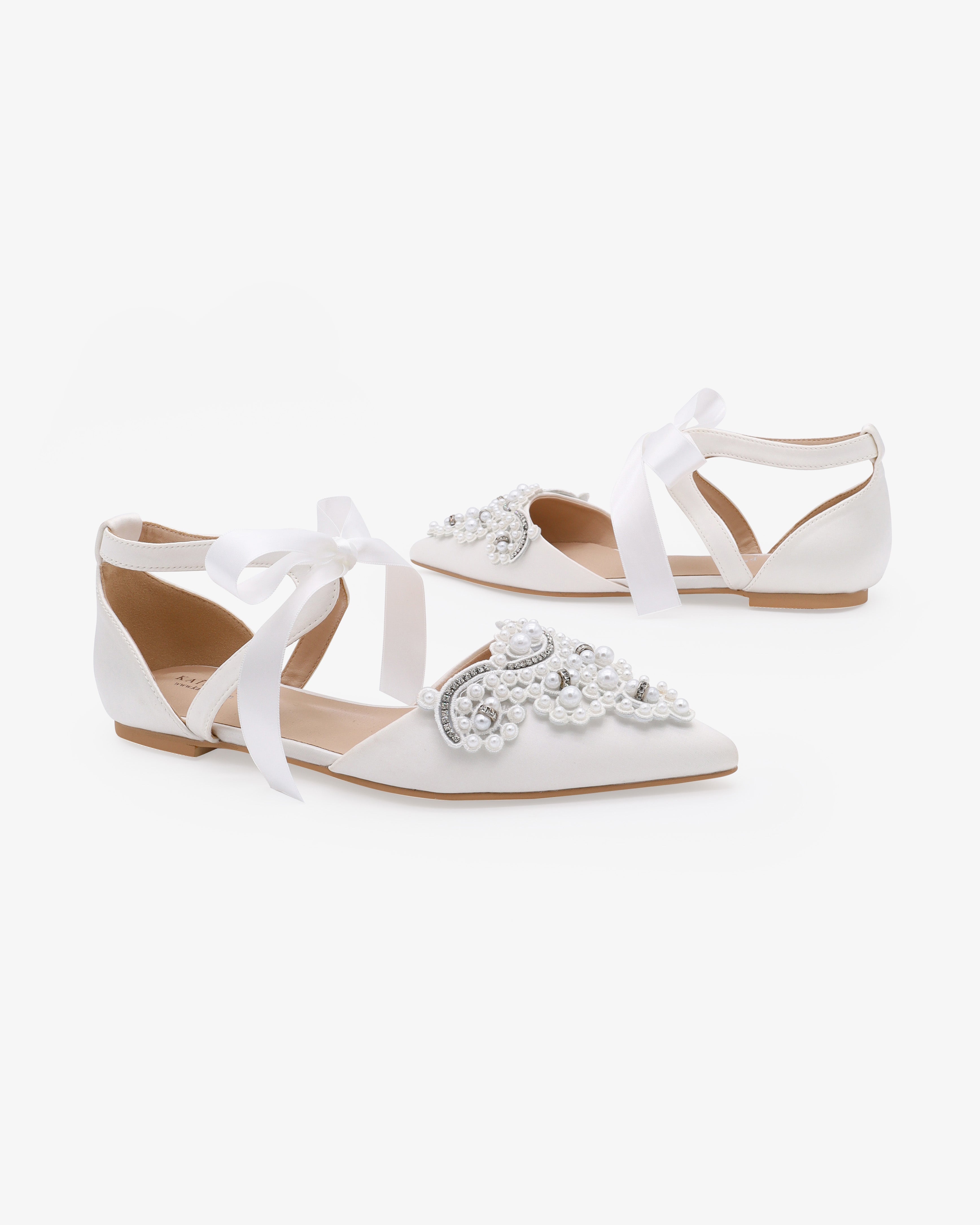 Satin Pointy Toe Flats with Oversized Pearls Applique